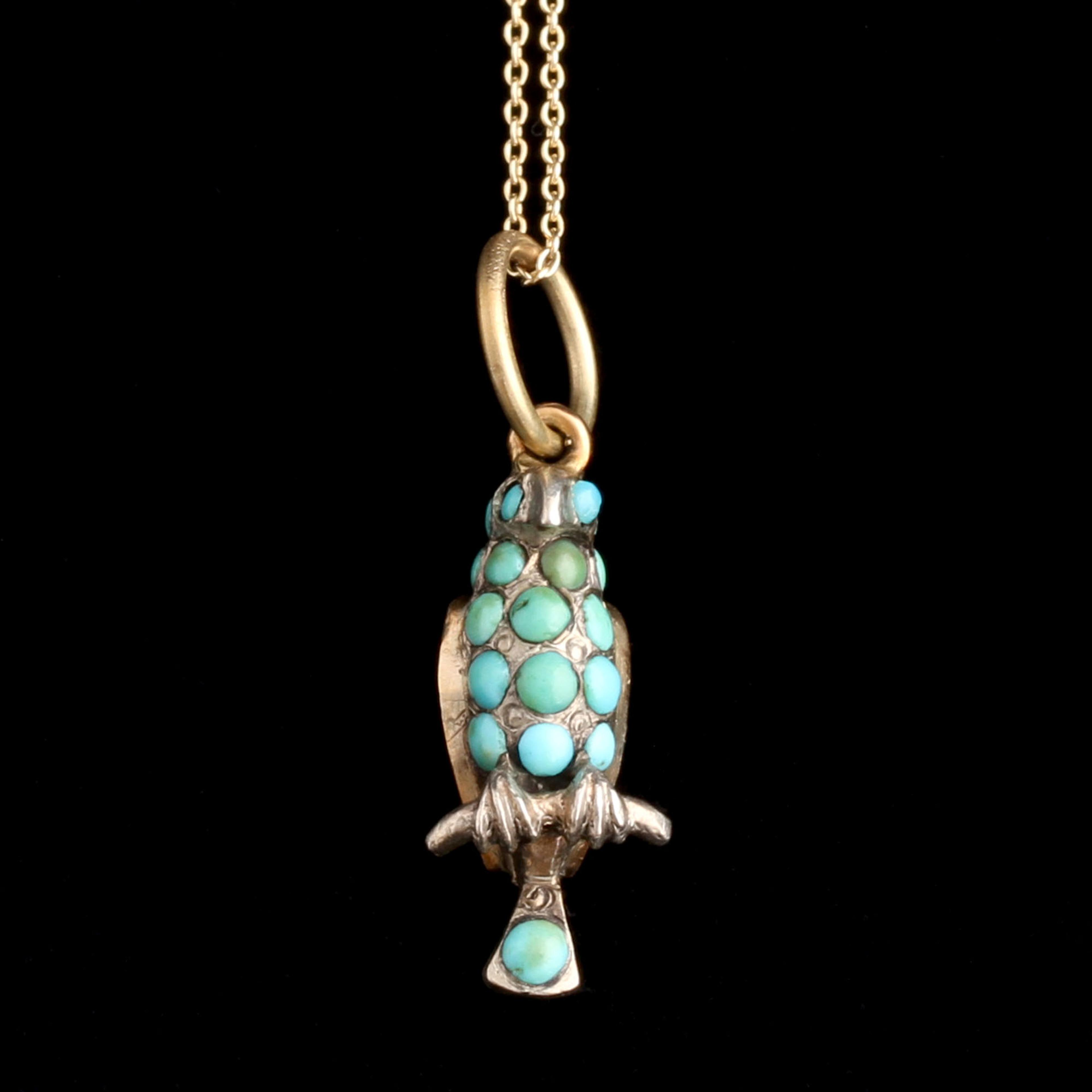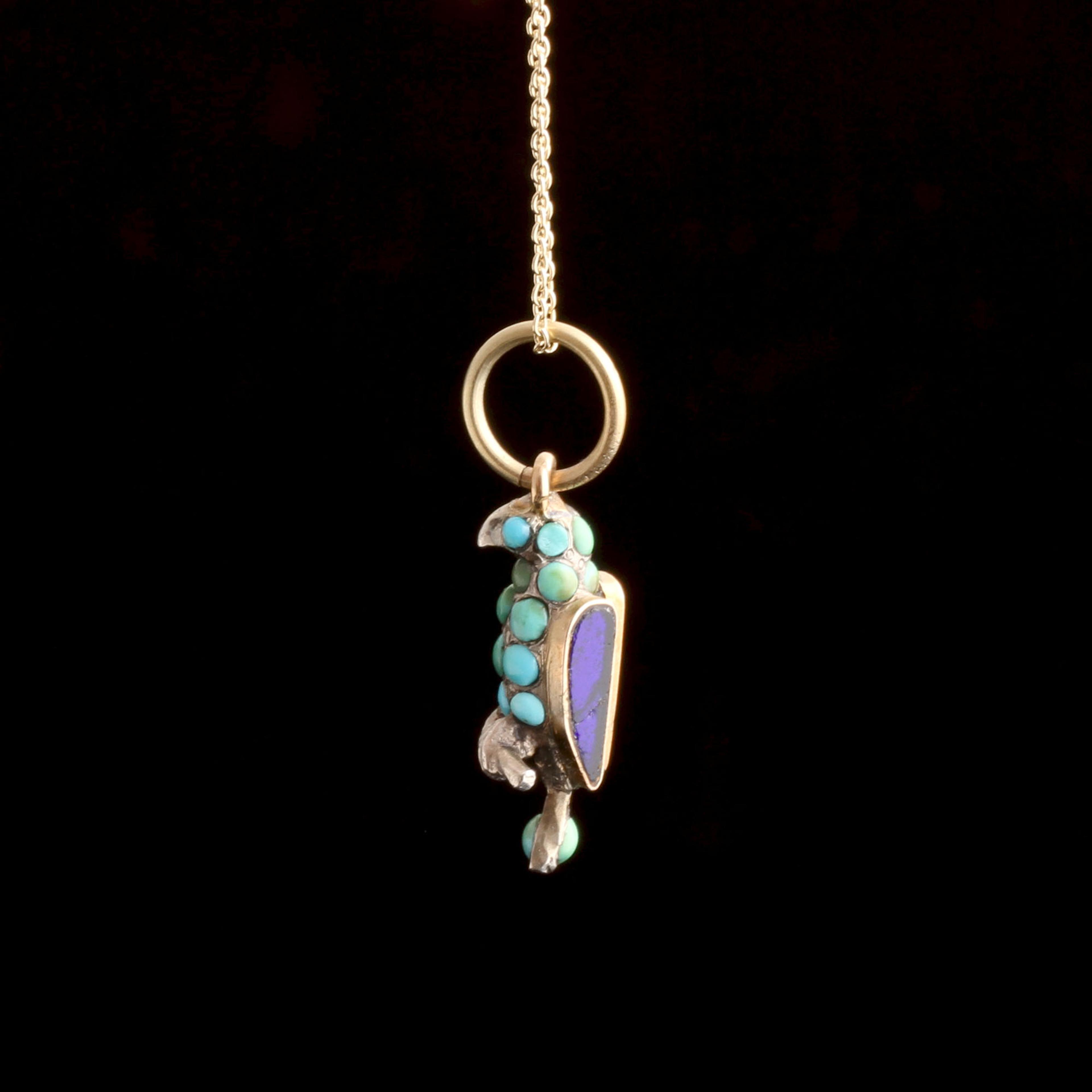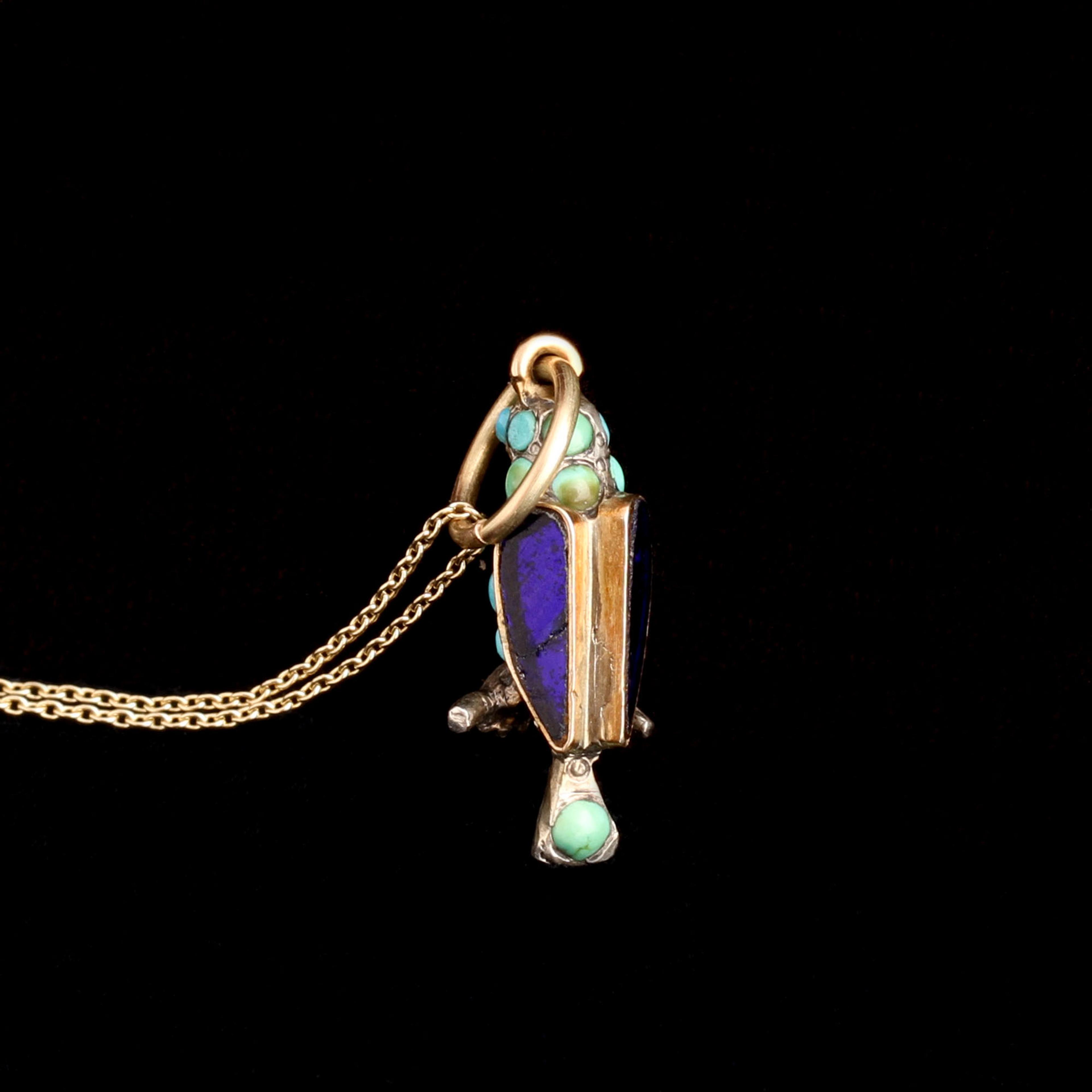 silver, 10k gold (tests), turquoise cabochons, blue glass, new 14k gold chain