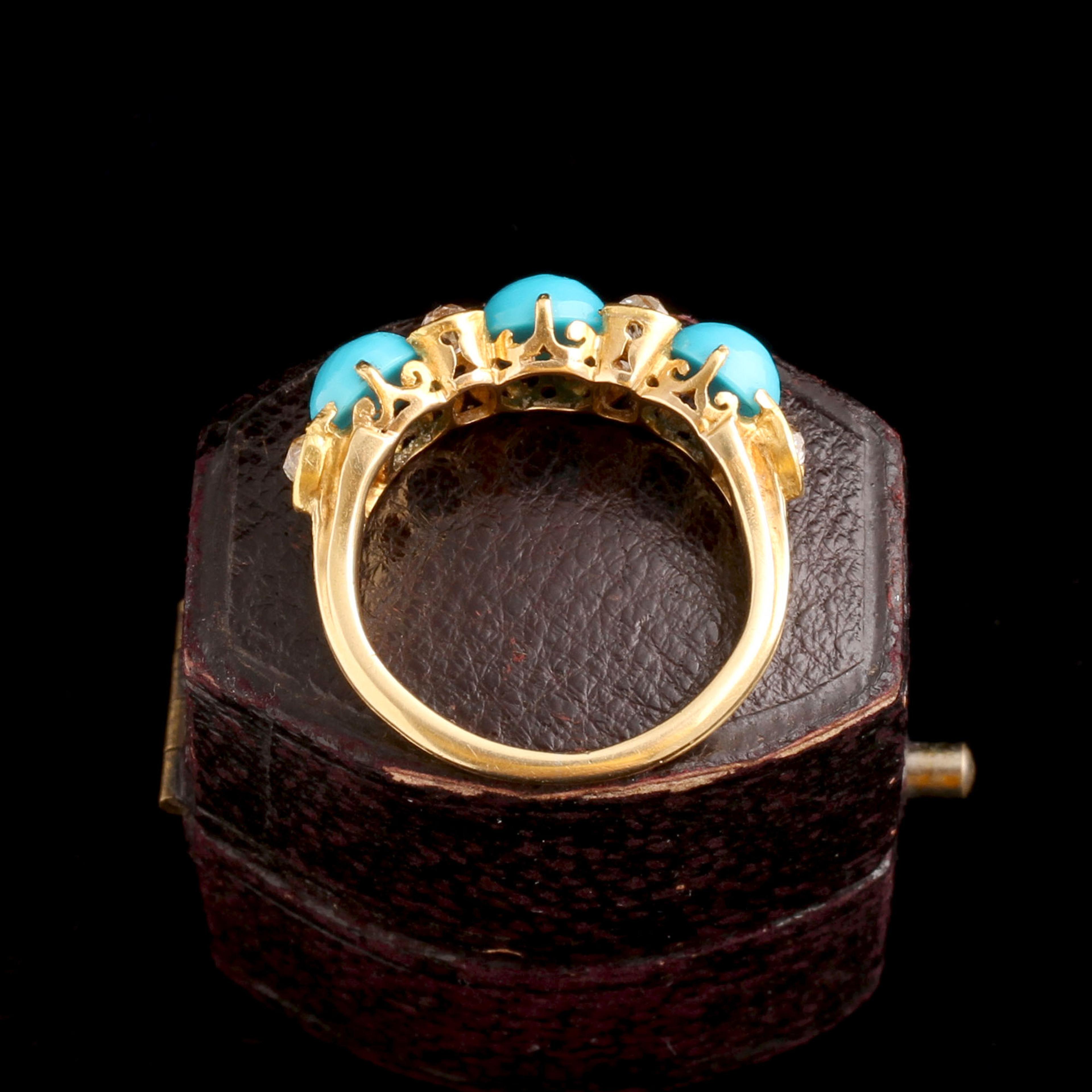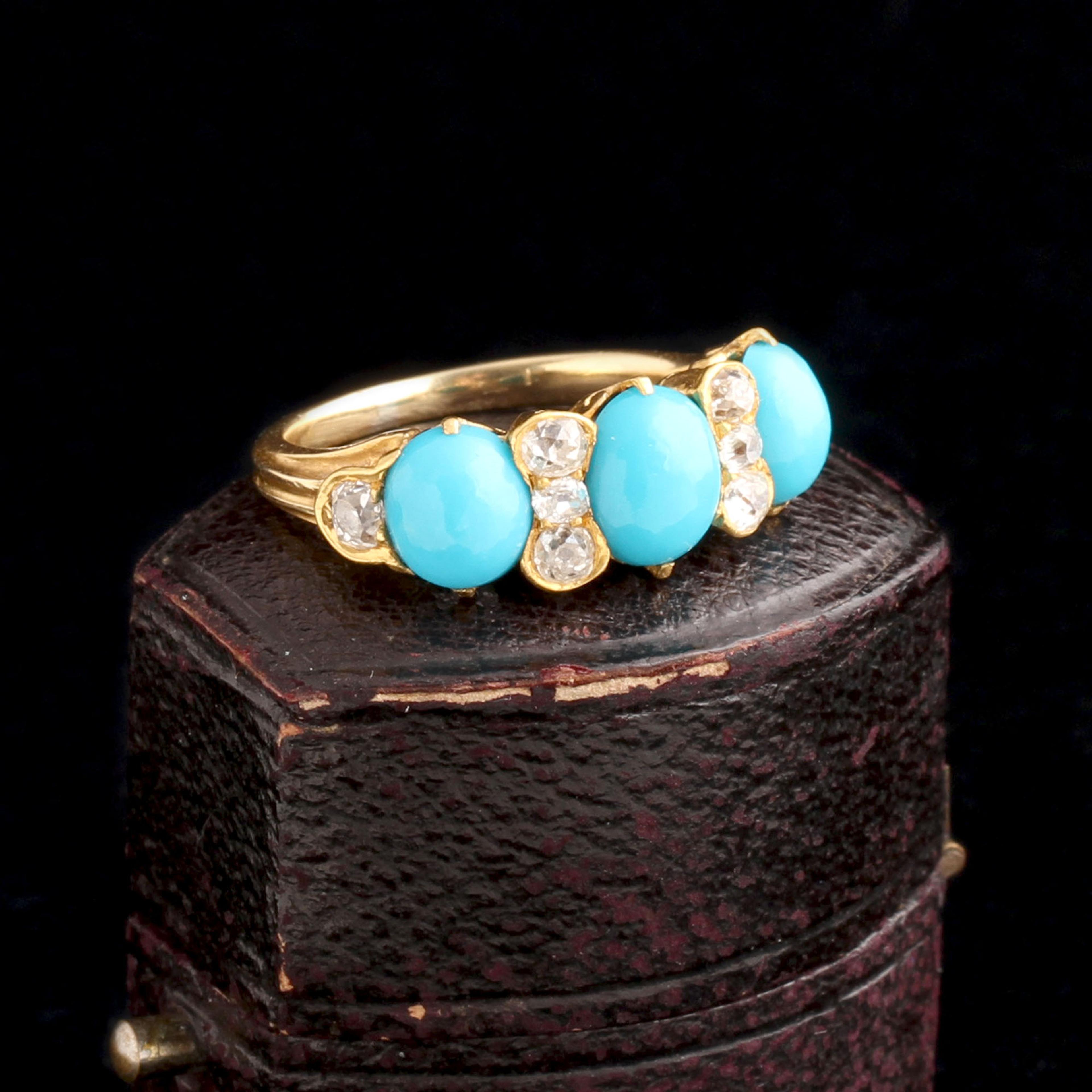 Lindsay says the diamonds look like bows. I think they look like they've been squished between some pushy turquoise cabochons. A fun, vibrant ring from the Victorian era with sophisticated old mine cut diamonds and an over-the-top mounting.