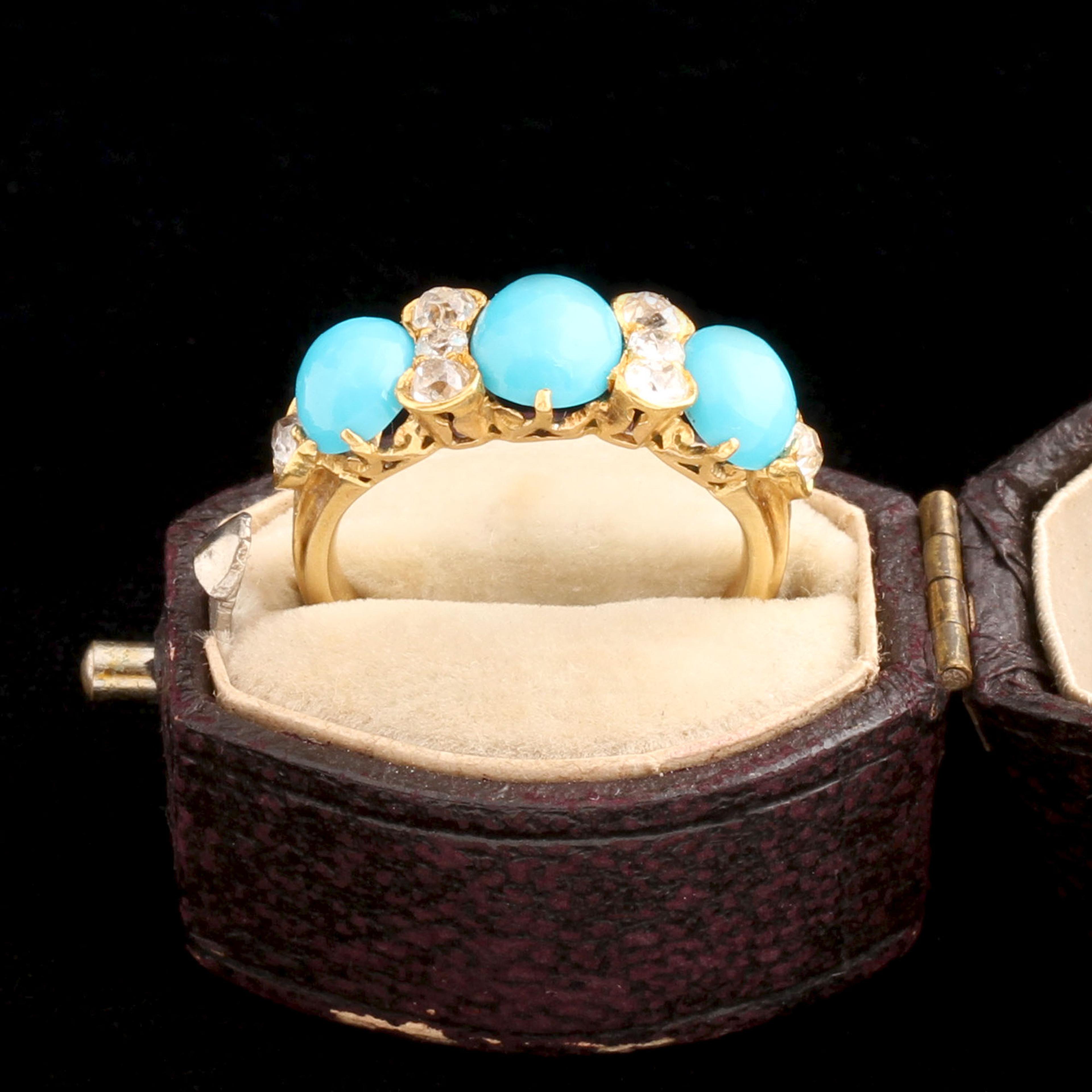 14k gold (tests), 2 7mm x 6mm oval turquoise cabochons, 7.3mm x 6.3mm oval turquoise cabochon, 8 old mine cut diamonds approximately .60ctw