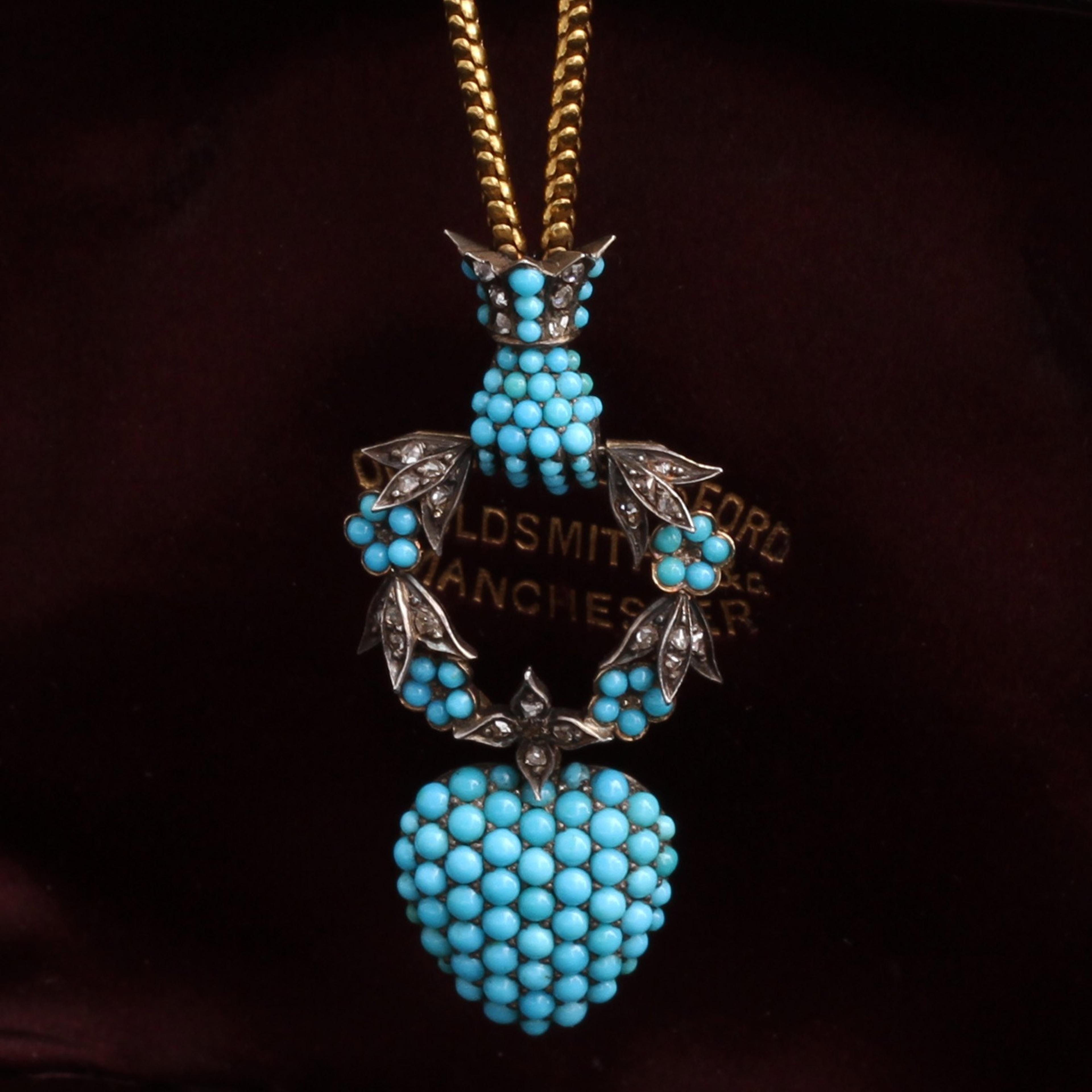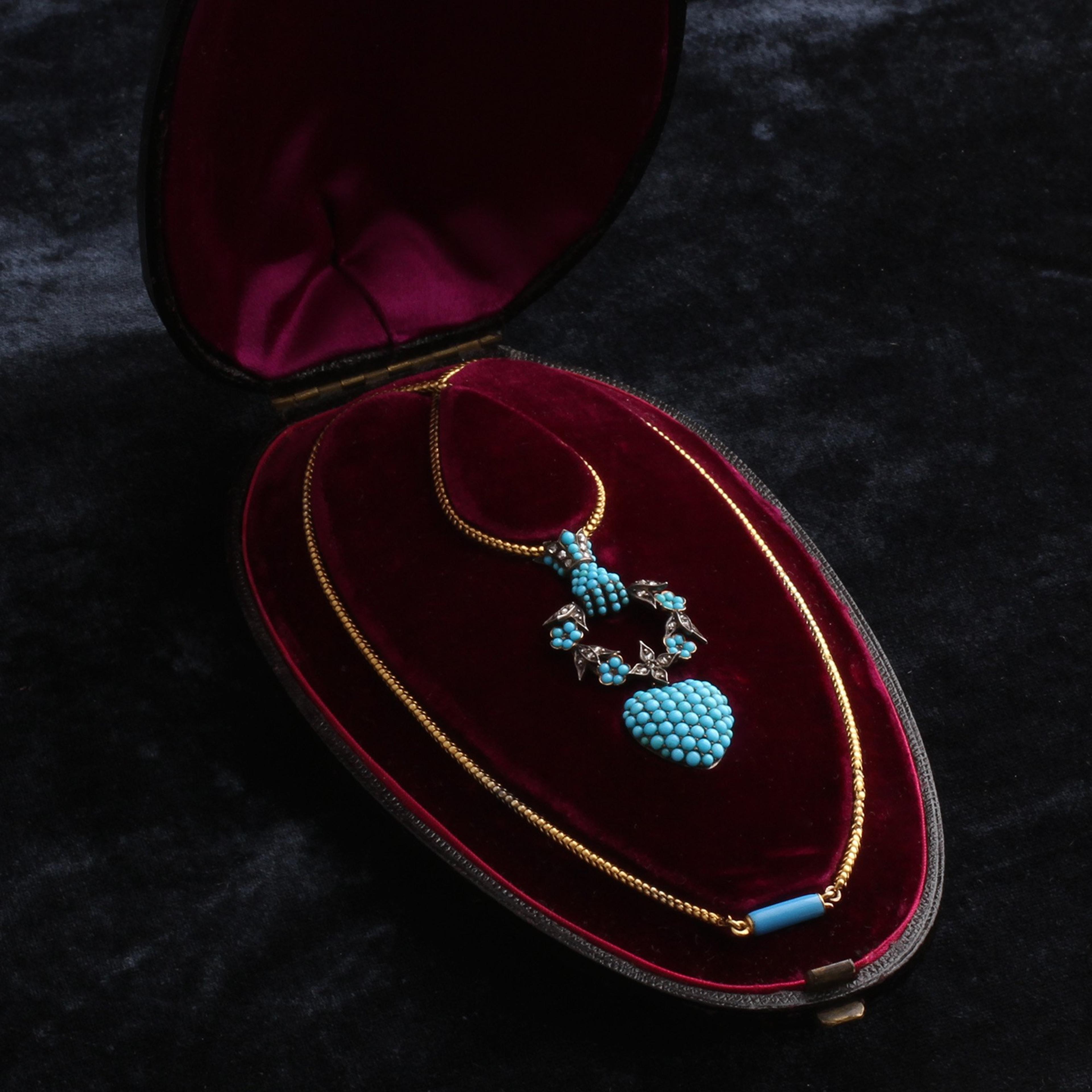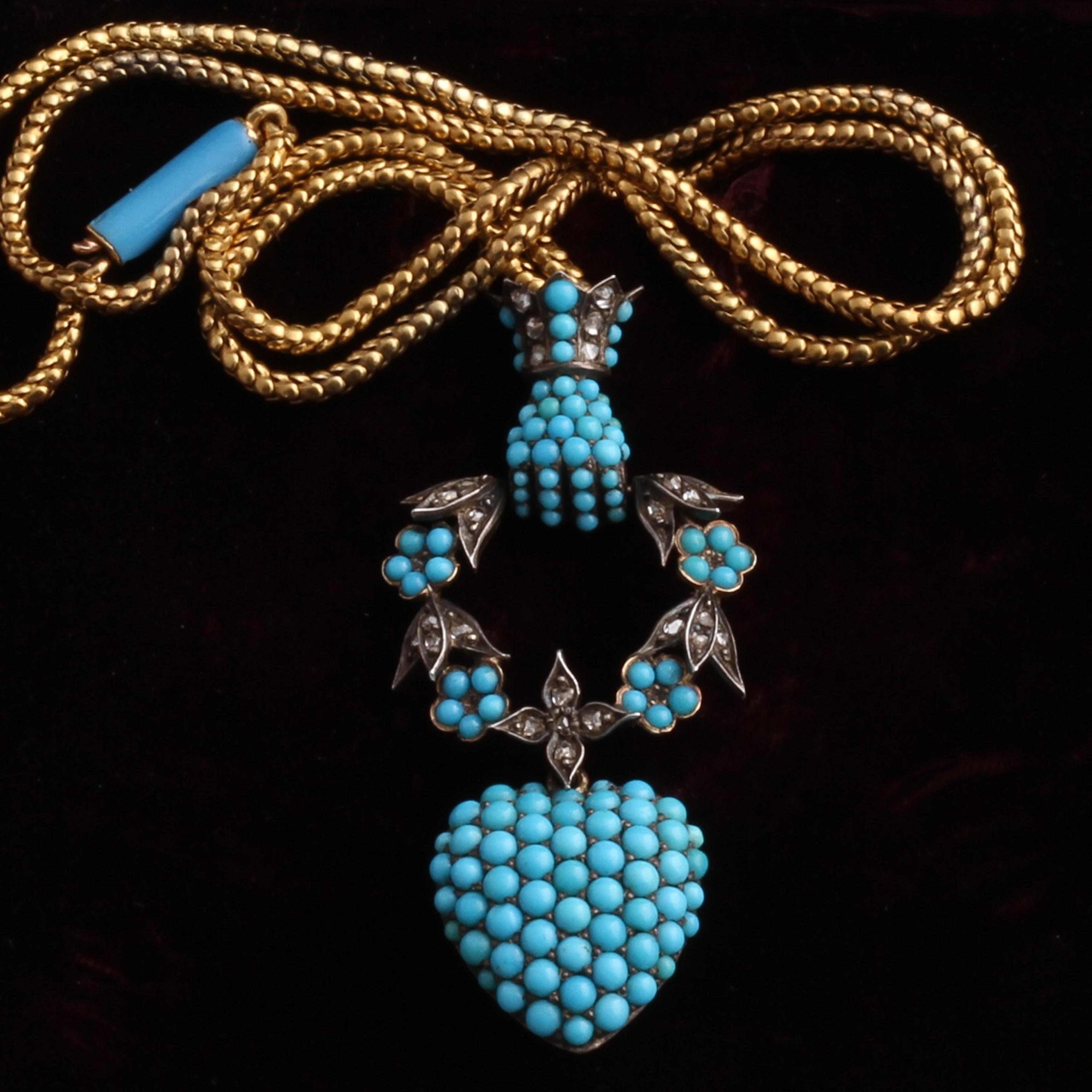 In early Islamic culture, turquoise was regarded as a sacred stone, prominently displayed in symbols of power and opulence. Once Eurasian trade routes evolved and the gem reached Europe, Westerners fell for for its sky blue color and exotic allure. In fact, the word "turquoise" is derived from the French pierre turque ("Turkish stone") which lends credence to the widely held belief that the stone was first brought to the Western world by the Turks in the 13th century. This sensational early Victorian necklace features a beautifully modeled cuffed hand grasping a wreath of forget me nots and a heart-shaped locket all studded in bright turquoise cabochons and flinty rose cut diamonds. The pendant is suspended from a substantial 18k gold chain and finished with a blue enamel clasp. This stunning and near immaculate piece comes in its original fitted box.