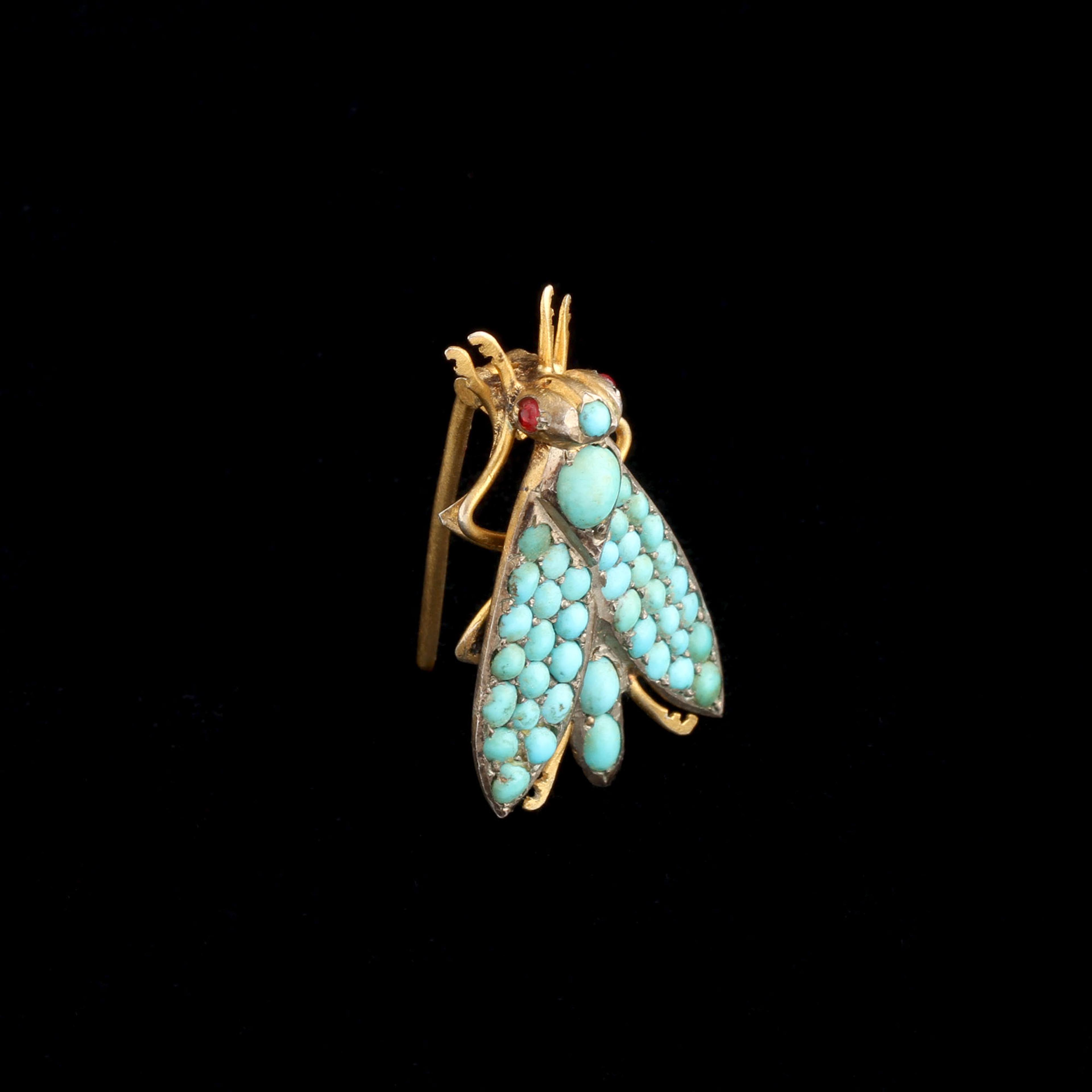 The Victorians loved bugs. Legendarily, they even made bejeweled leashes on which exotic LIVE insects paraded around on their clothing. A safety pin or brooch held the other end of the chain in place so the prized grasshopper or whatever didn't wander too far. This is my Holy Grail piece - if anyone ever finds a Victorian bug leash? Hit me up. Anyway, jeweled moth? Totally standard for 1880. This is a charming little guy with garnet eyes and a turquoise bod. If you couldn't have a live one as an accessory, you could settle for this.