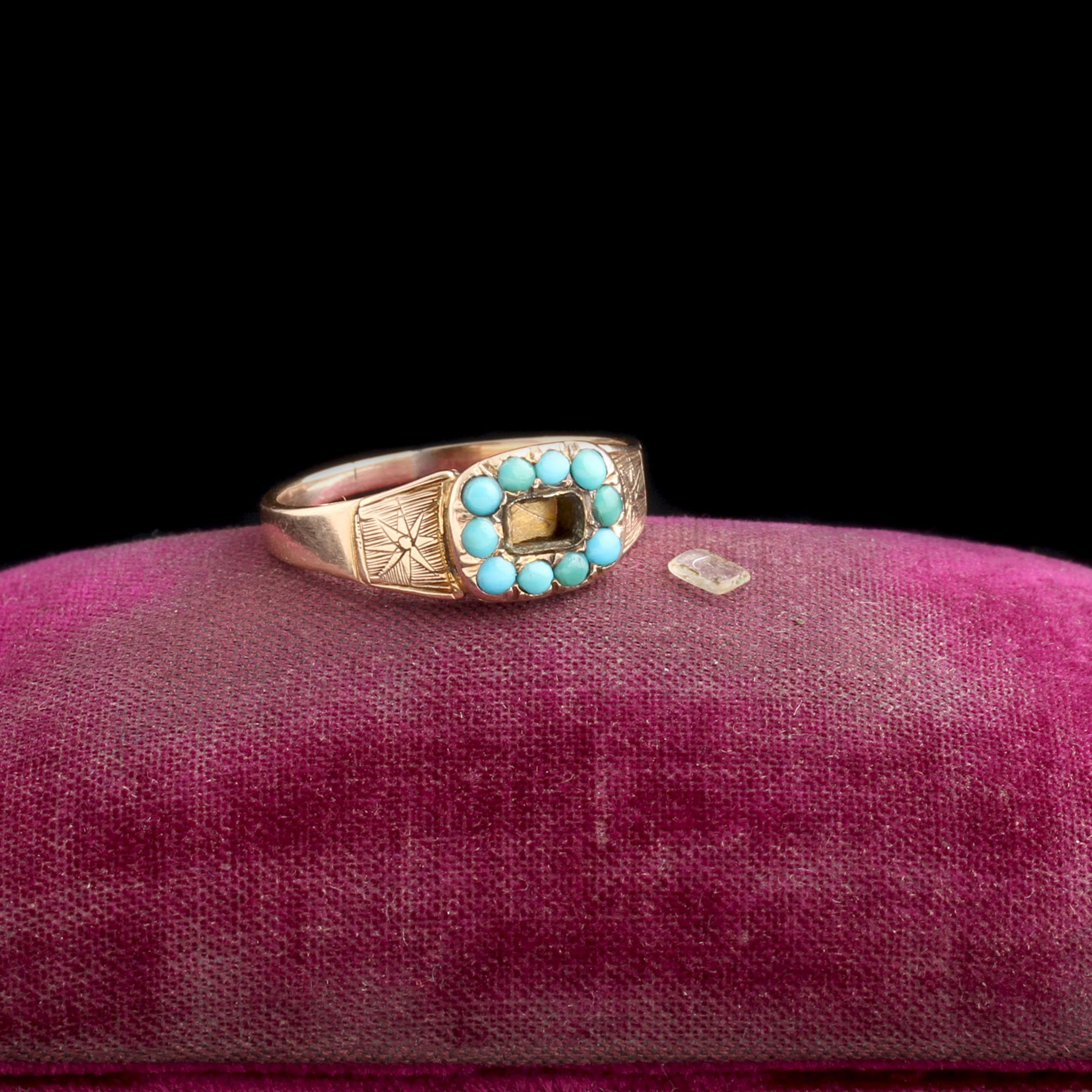 Star-shaped hand-engraved details on the shoulders make this locket ring special. The space beneath the glass is empty; once there was hair, but it was in rough shape so we removed it and gave the ring a good cleaning. You can add your own hair, tiny image, or other memento; a local jeweler can help you secure the glass back down. Turquoise cabochons are slightly discolored - in the most beautiful way - by age.