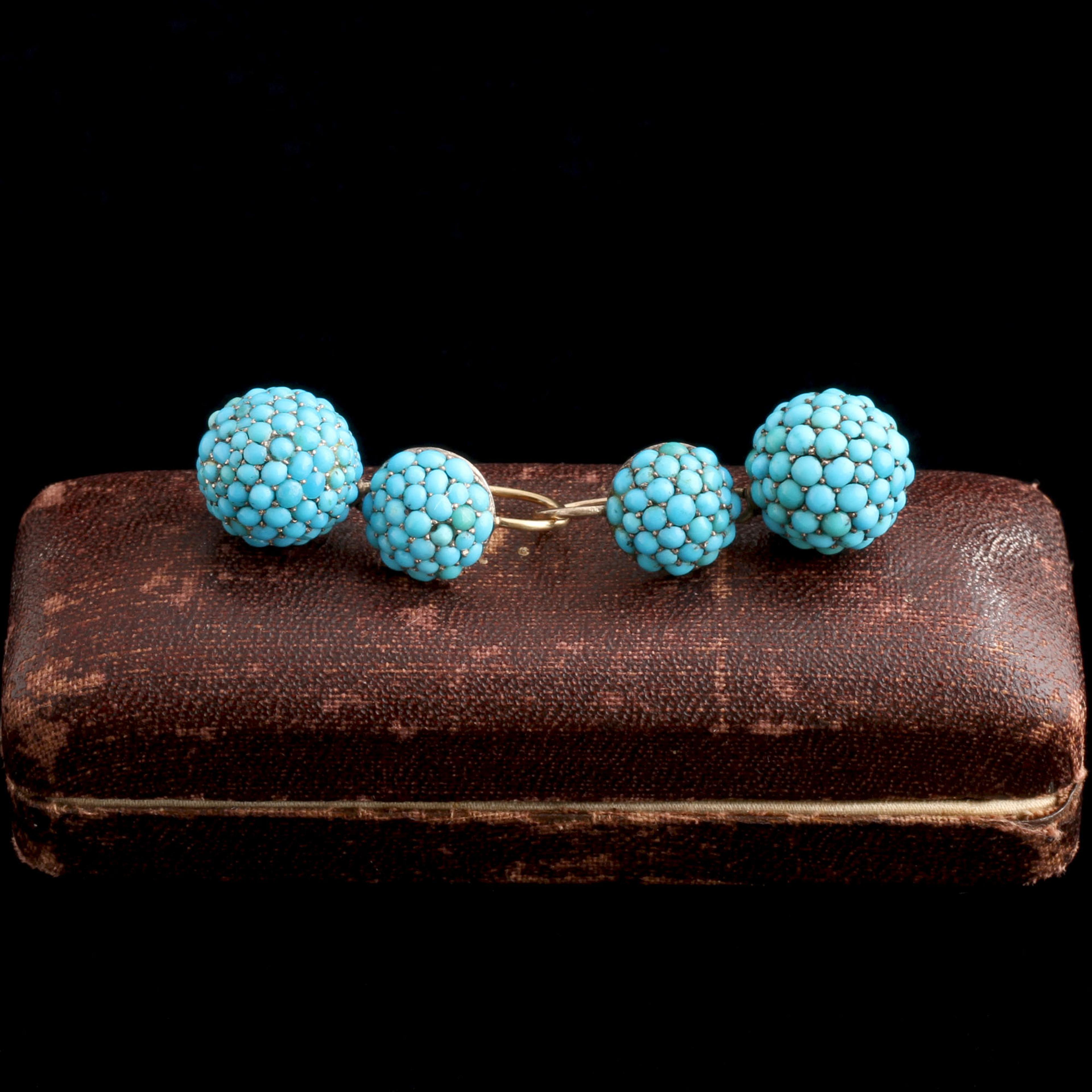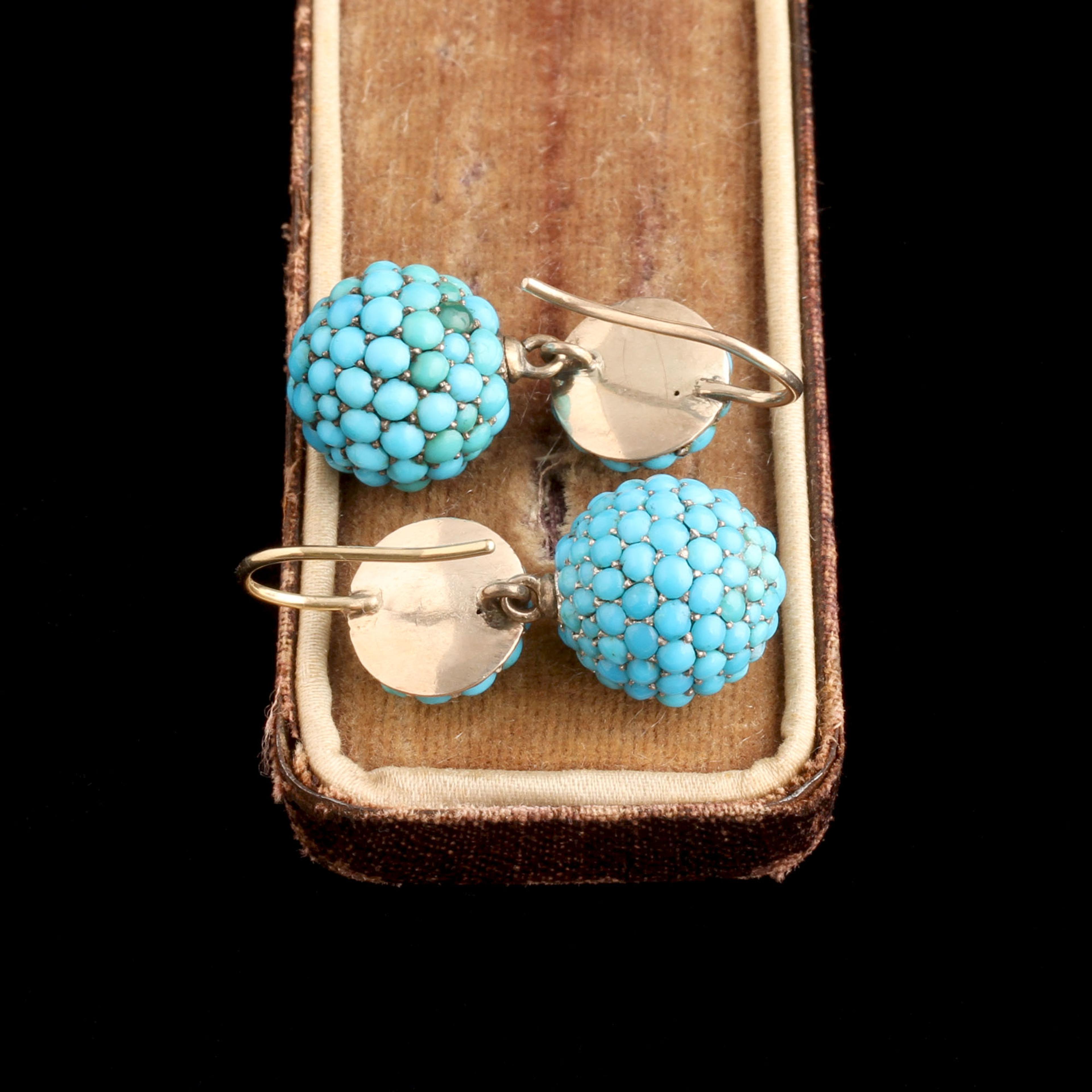 PAVÉ IS A French word for something very simple. It means the stones are “paved” onto a surface. Jewelers worked precious metal and stones much like bricklayers, setting tiny cabochons into small, pre-made cavities until the entire surface was covered. The technique creates an especially striking effect with a vivid stone like turquoise, where the eye reads color before form. In these late Victorian earrings, subtle, age-softened variations in the turquoise add depth and character.