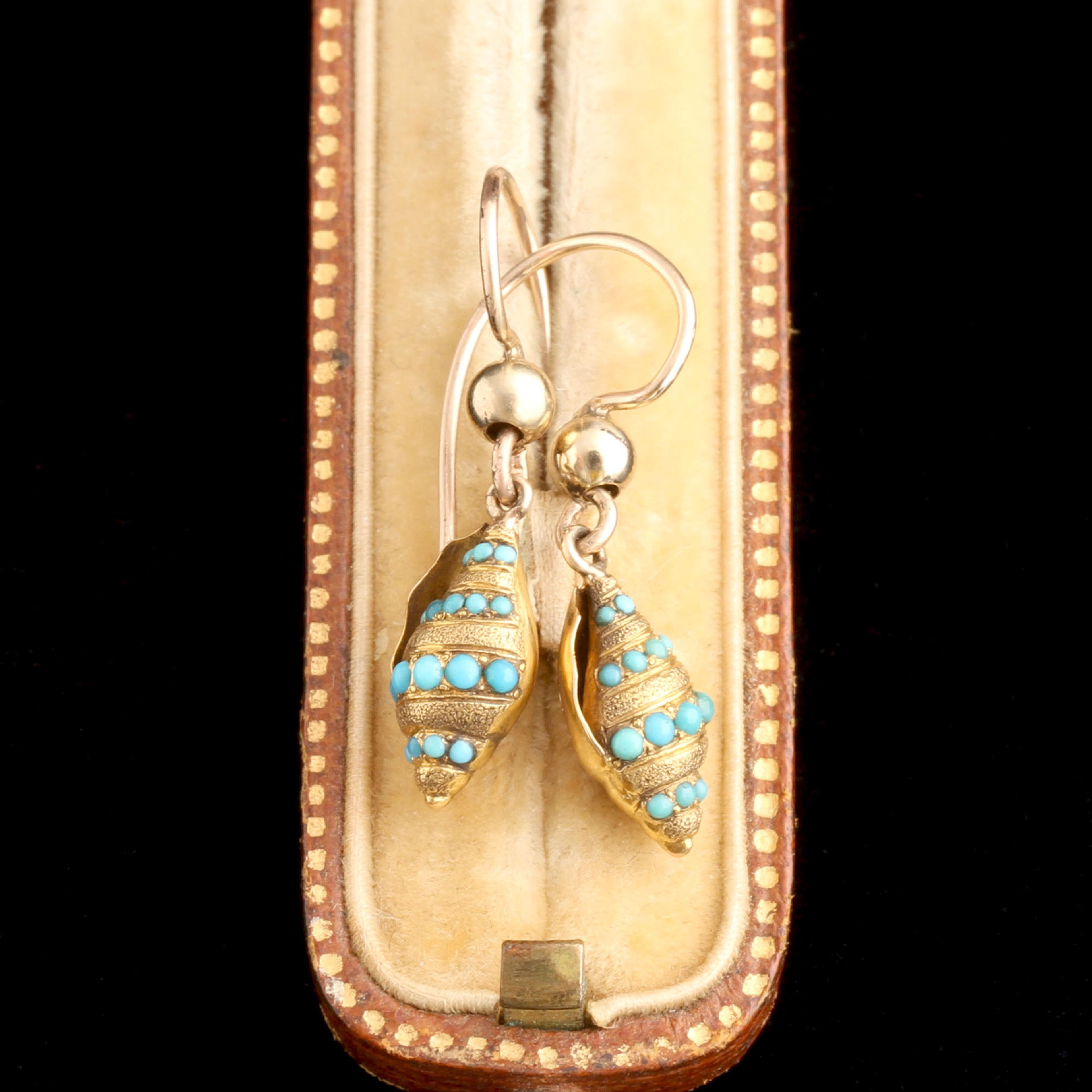Small in scale but big on charm, these late Victorian shell earrings are modeled in gold and set with graduated turquoise cabochons.