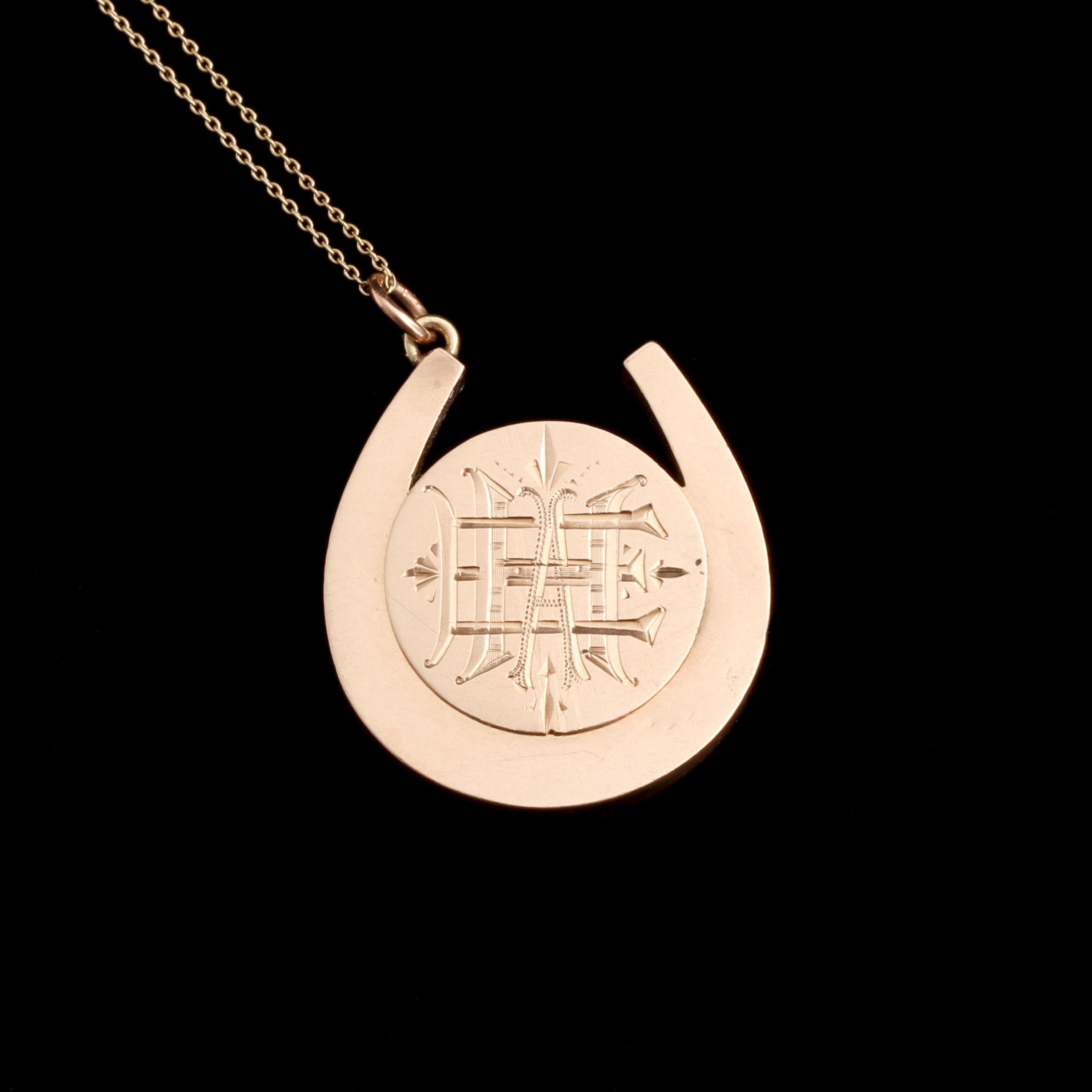 Multiple layers of symbolism here: turquoise for friendship, seven lucky nails on a horseshoe for good fortune. You can add your image or a memento under the lens, and a nearly abstract monogram decorates the reverse.