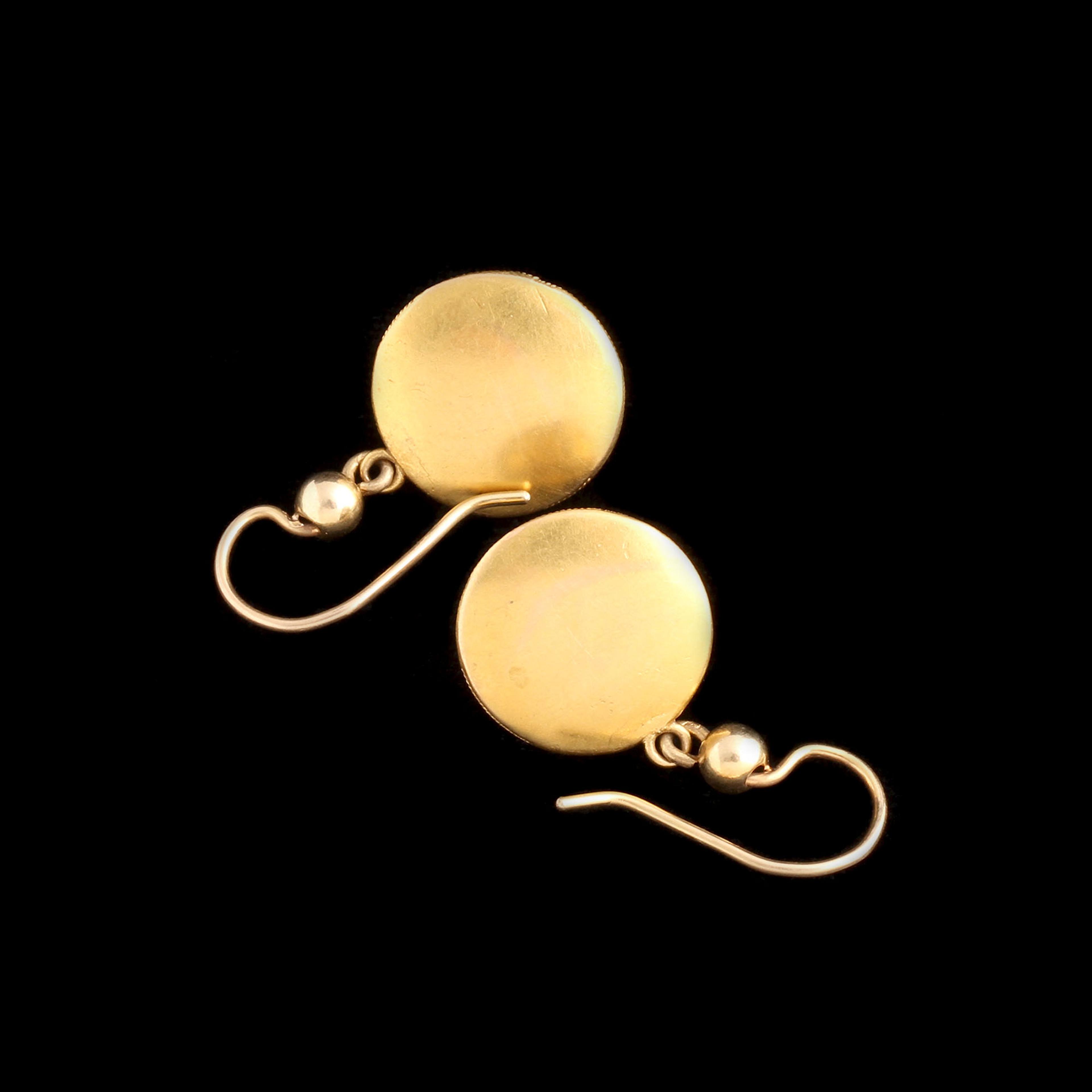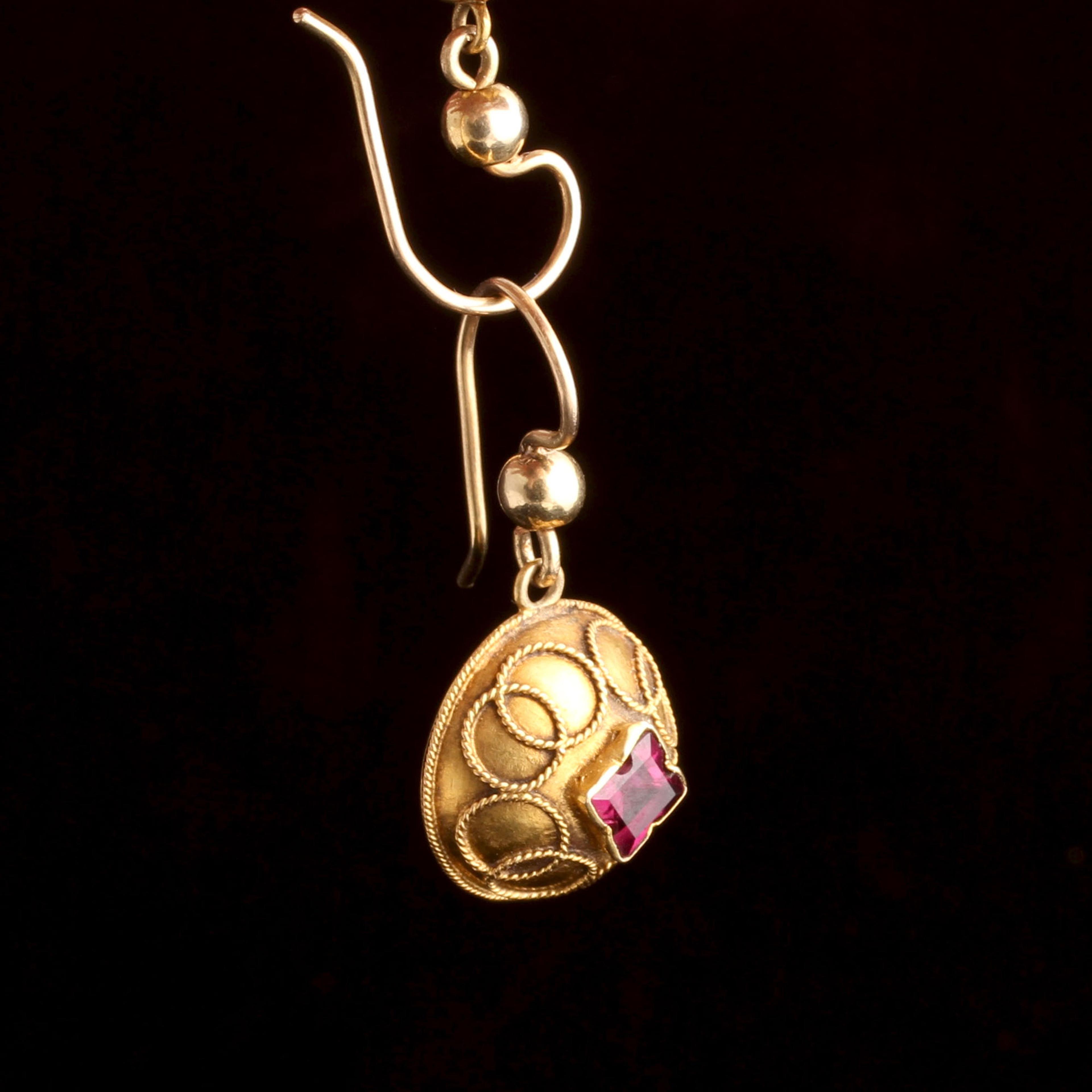 Victorian half dome earrings modeled in gold with Venn diagram-esque overlapping twisted wire circles haloing the fancy cut garnets at the center.