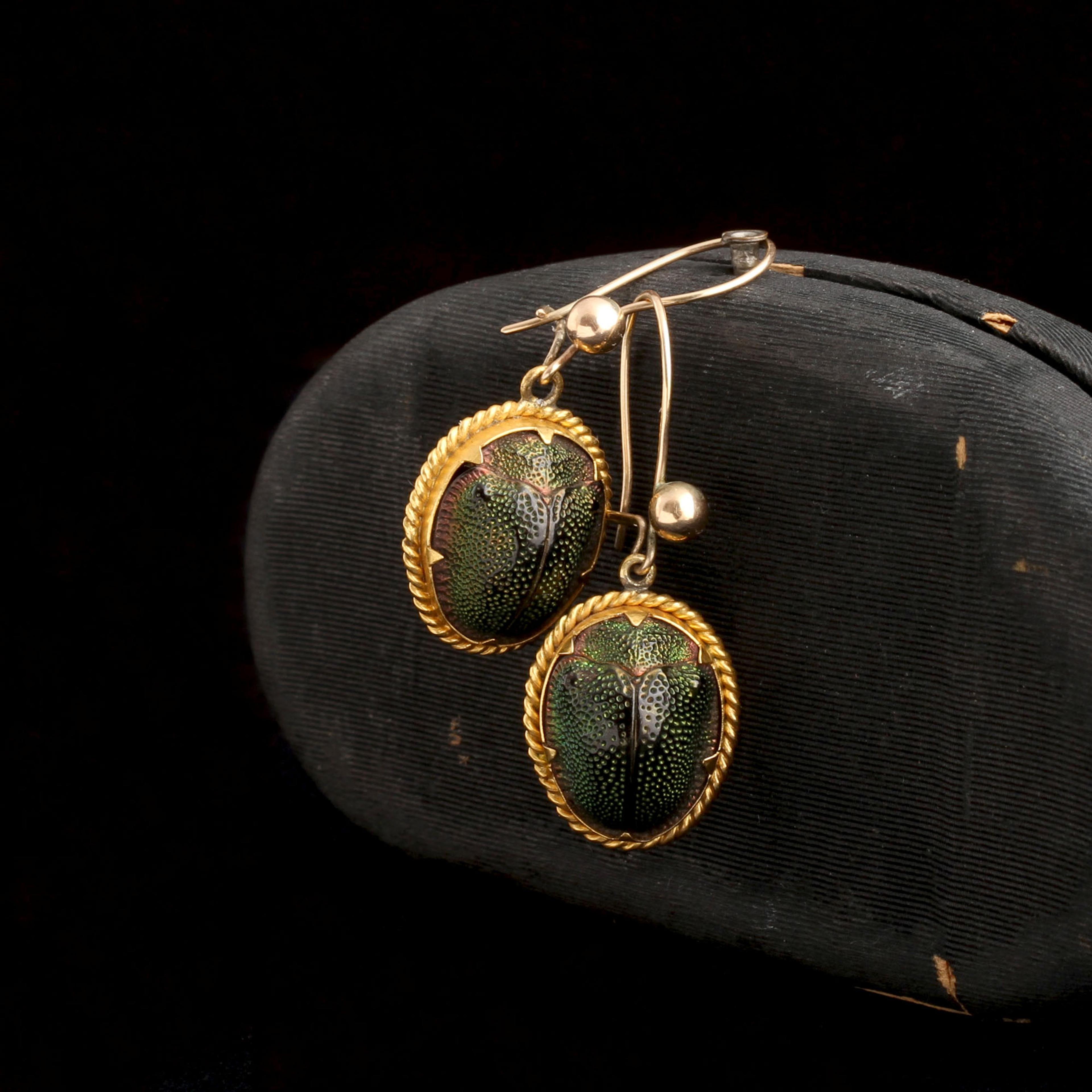 THE WESTERN world became fascinated with ancient Egyptian culture during Napoleon's Egyptian campaign, 1798-1801. By the late 1800s, archaeological finds - sarcophagi, mummies, hieroglyphics - were making news all over Europe, and Egyptian design motifs made their way into Western art, fashion, and architecture. These English earrings are fashioned in gold with iridescent (real!) beetles meant to evoke scarabs.