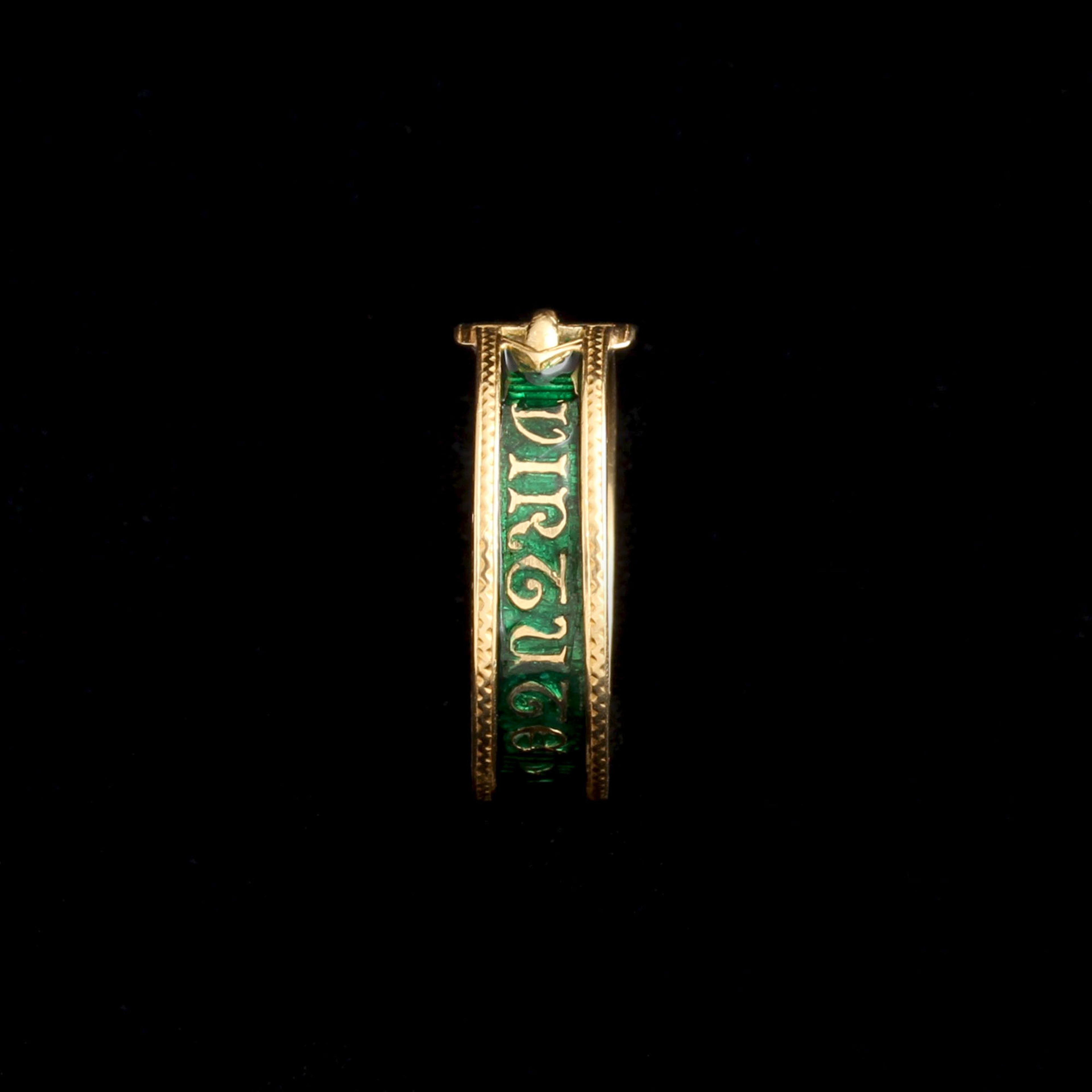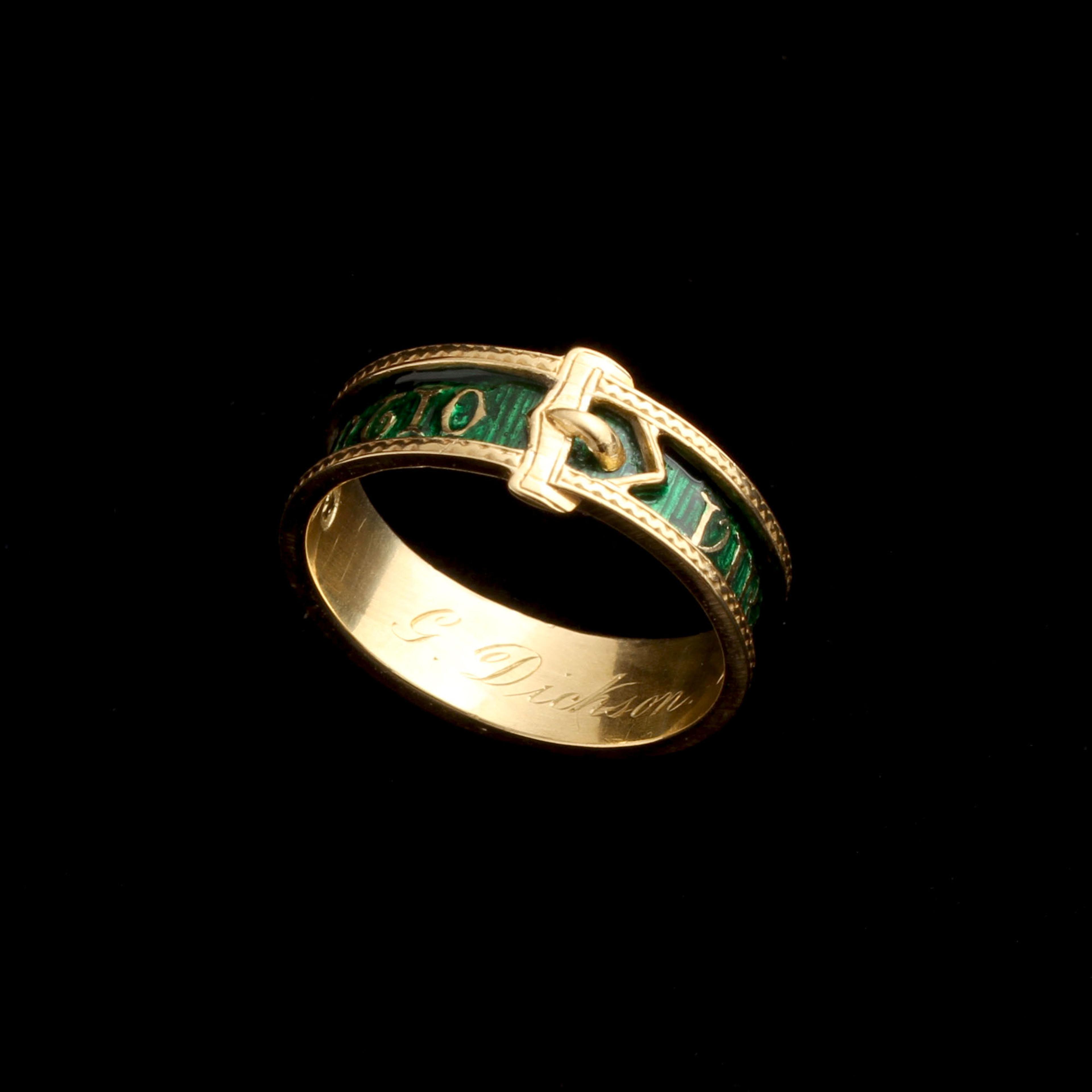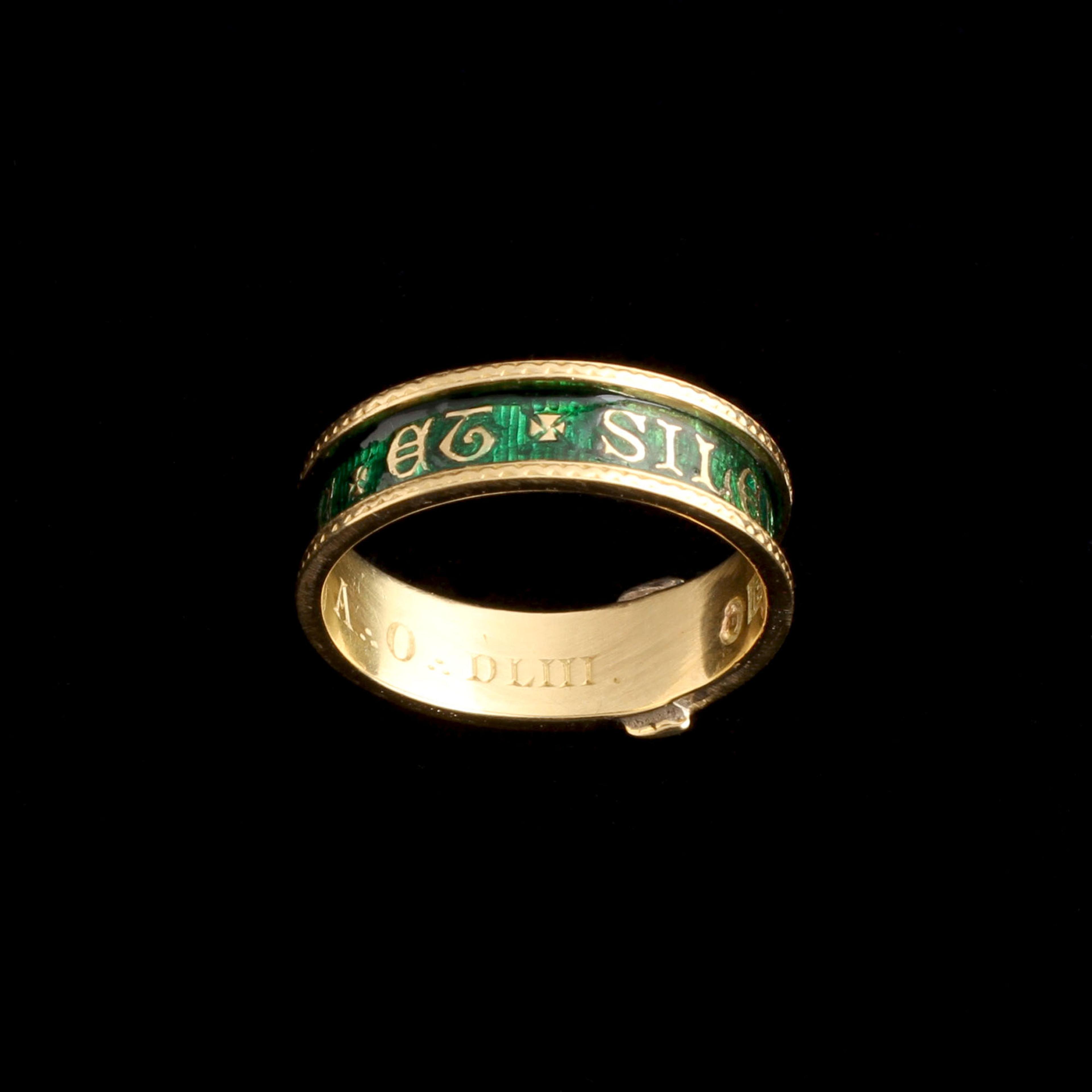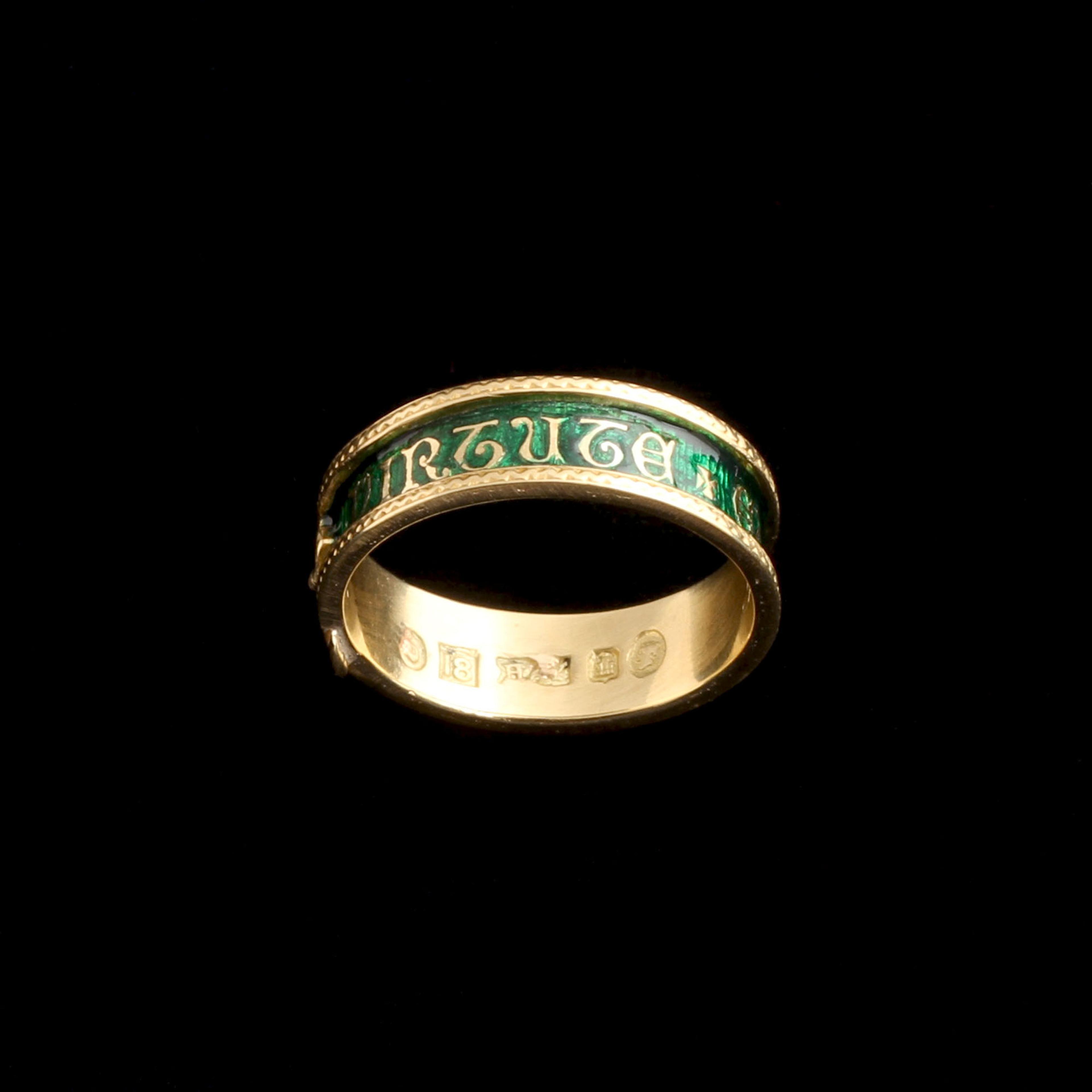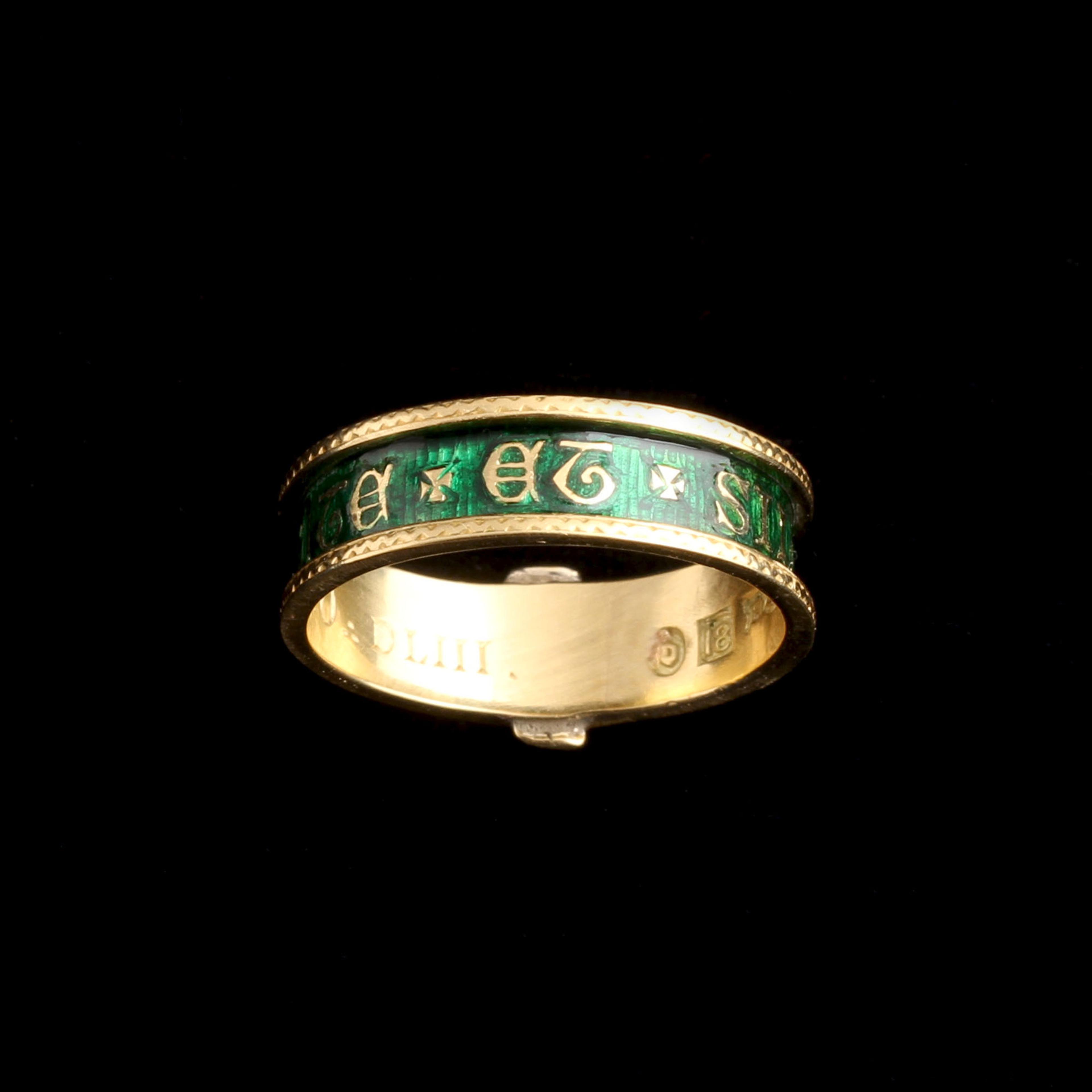 THIS VICTORIAN Masonic ring bears the motto Virtute et Silentio, a phrase associated with moral discipline and secrecy within Freemasonry. The band, in the shape of a garter, purposefully echoes chivalric orders and oath-bound societies of centuries past. Inside, the ring is engraved G. Dickson A O DLIII, identifying Dr George Dickson, a prominent Scottish Freemason and occult thinker active in late Victorian Edinburgh. Dickson was deeply engaged in British occultism and is believed to have been involved with the Hermetic Brotherhood of Luxor, a group that helped shape modern ceremonial magic. Scotland - and Edinburgh in particular - was the center for this secret society of esoteric thinkers. To Dickson, this ring was a personal ornament, but also a dog whistle - if you could read the symbols, you might be an occultist, too. It's stamped with Edinburgh hallmarks for 1895.