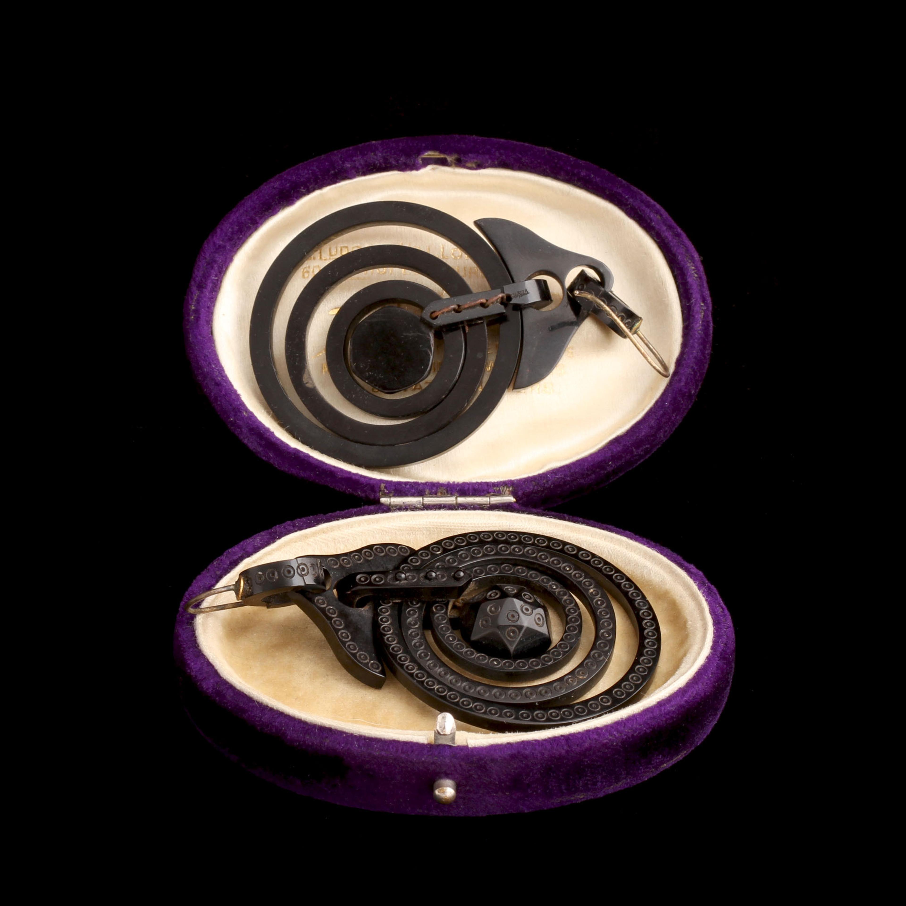Vulcanite - a combination of sulphur and India rubber - was developed in the mid 19th century, mostly by Charles Goodyear (the tire guy). It can be white or lots of other colors, plus it's easy to work with, so it was often used to imitate coral, tortoiseshell and jet - especially the latter, as black mourning jewelry became more popular. These spectacular earrings are made in vulcanite with decorative bullseye shapes etched around each ring, edge and on the facets of the pendant at the center. Note the way the concentric circles have been sewn together along the back panel - divine!
