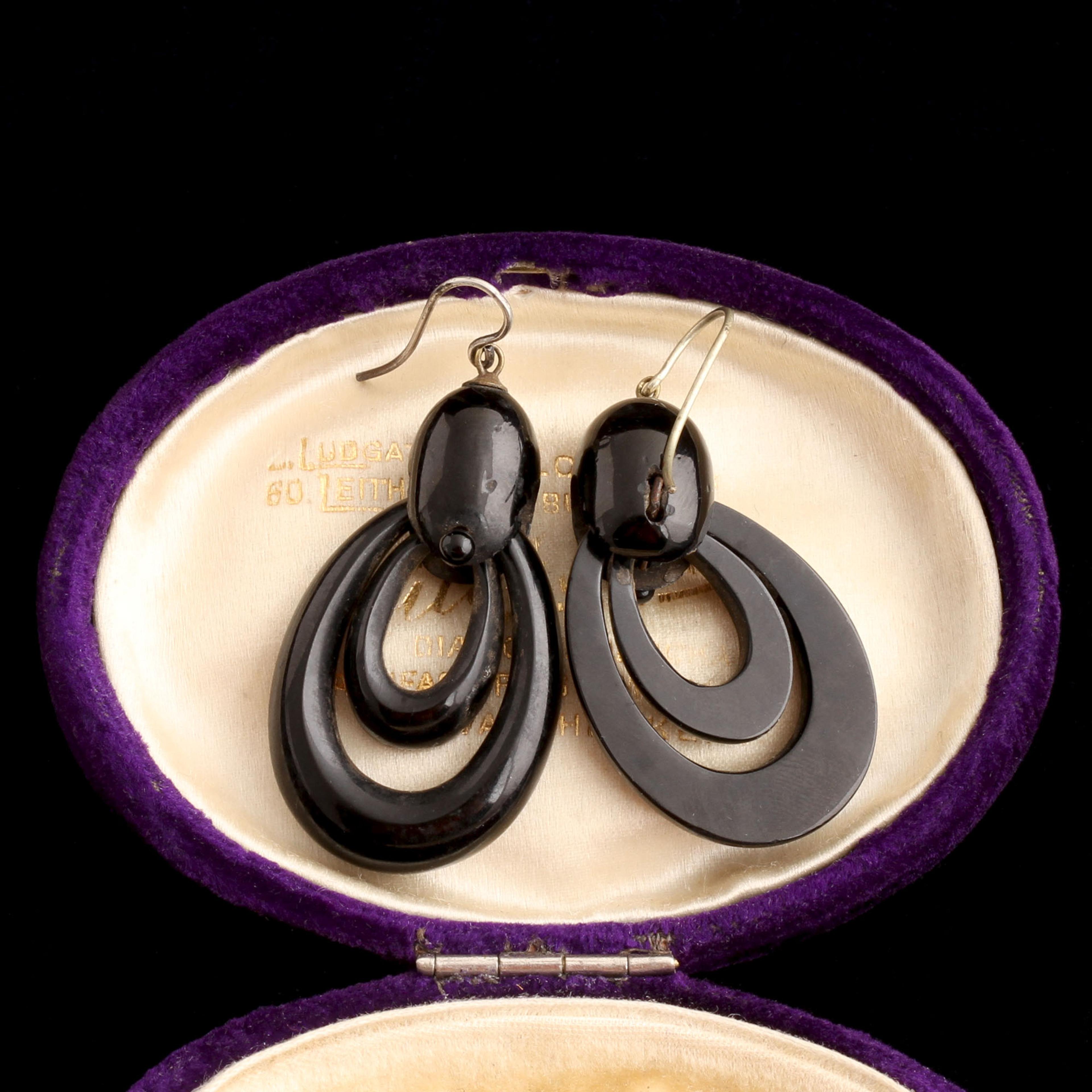 These carved jet earrings were once part of a Victorian woman's mourning ensemble. In the first stages of mourning the bereaved wore only black, so any jewelry also had to be dark-colored and preferably matte. Jet, mined in the Yorkshire town of Whitby, fulfilled these requirements for mourning jewelry extraordinarily well and was popularly used by the Victorians until the mines were more or less exhausted of their supply. Jet itself is a mineraloid formed by the fossilized wood of the monkey-puzzle tree, and the jet harvested in Whitby dates back to the Jurassic period (that makes it 182 million years old). These lightweight earrings are carved in a modern double hoop design with silver ear wires.
