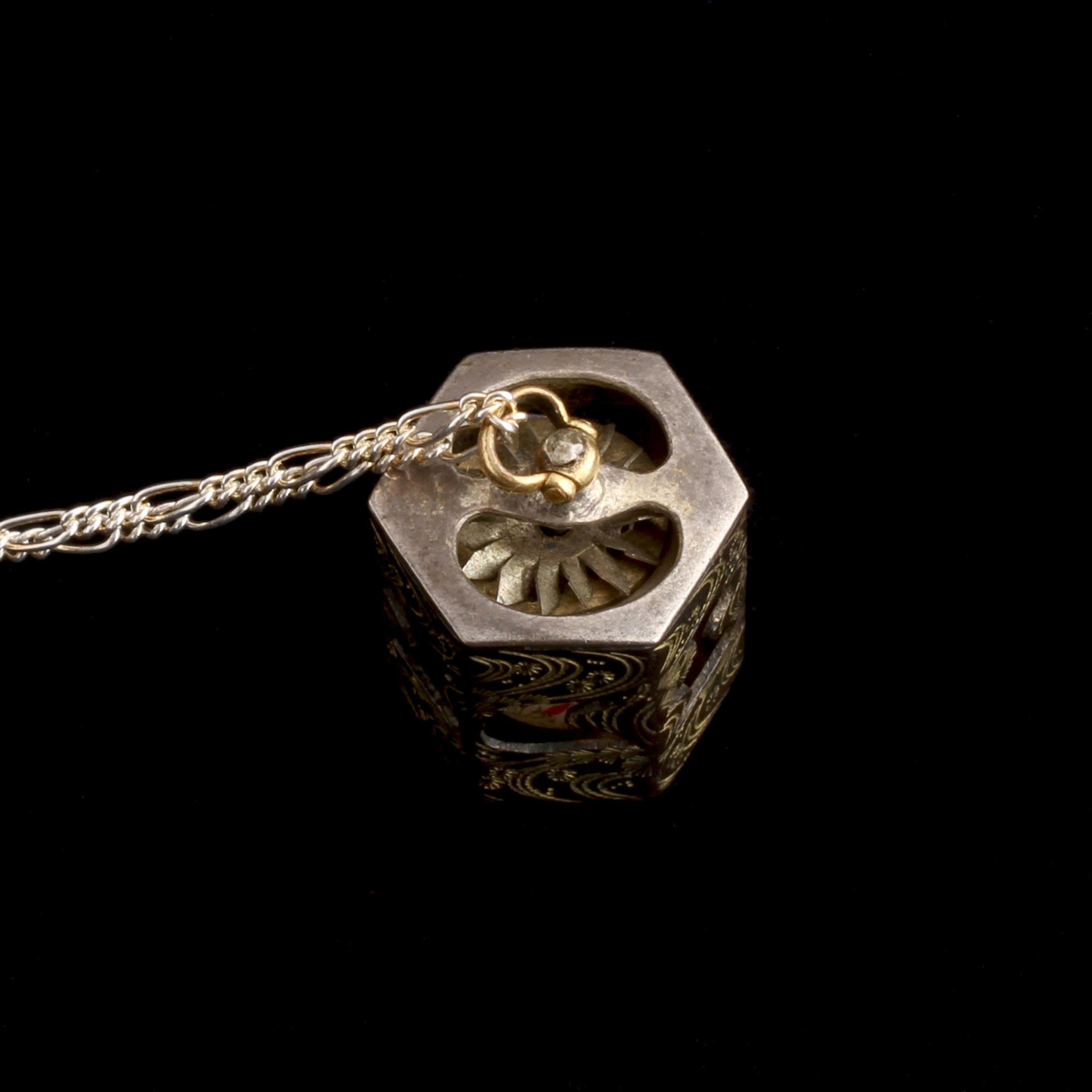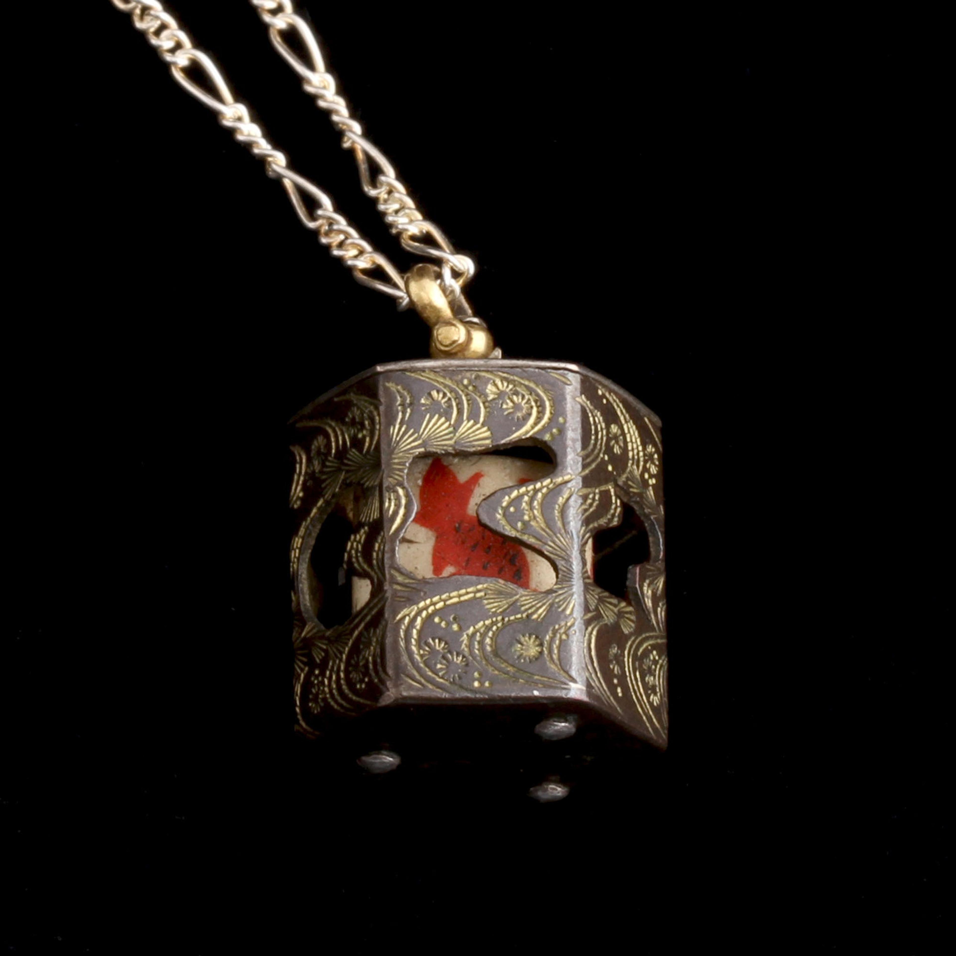 A novelty vintage pendant designed to amuse the wearer. A game (of a sort) in which the point (we think) is to get a glimpse of the little red fox on the inner cylinder.