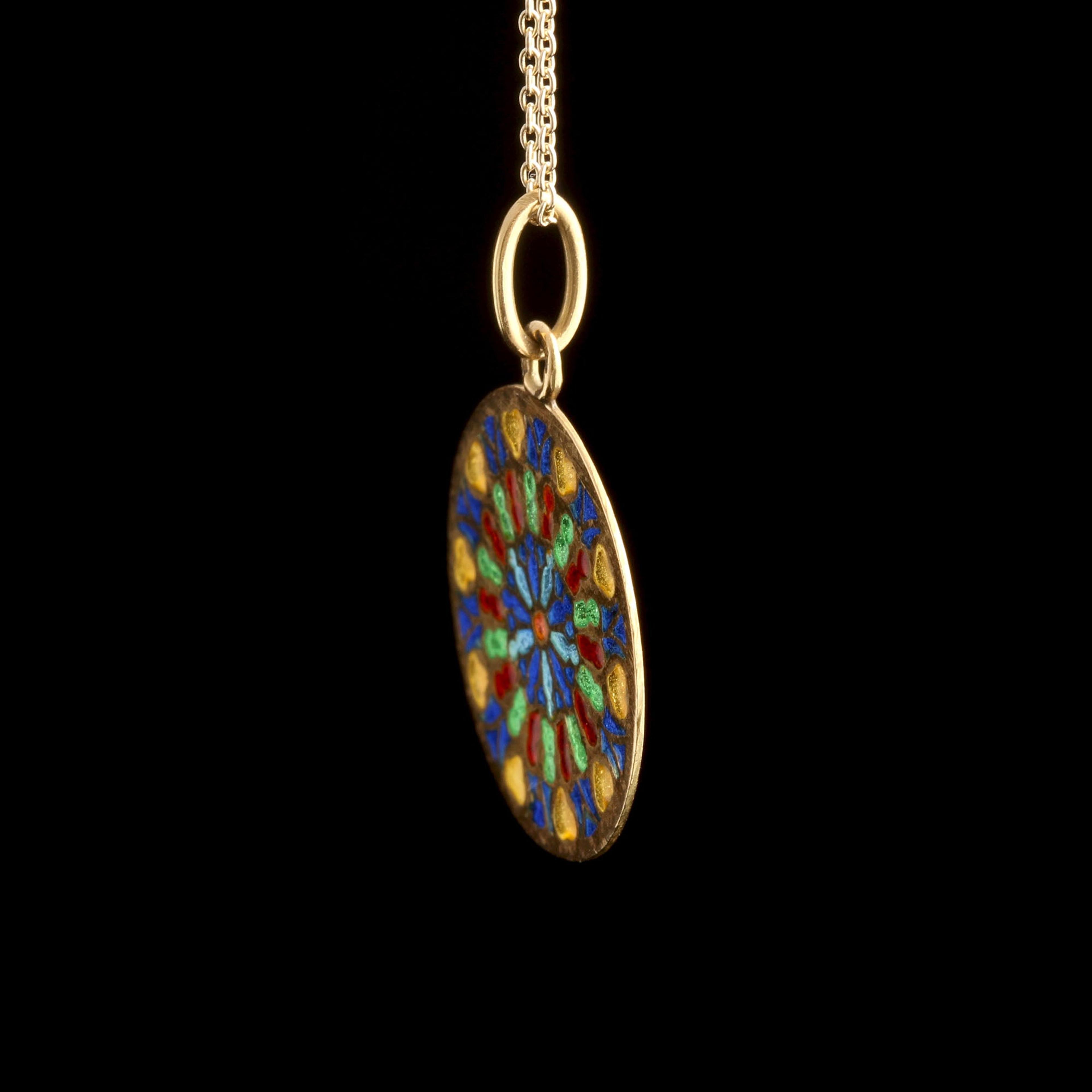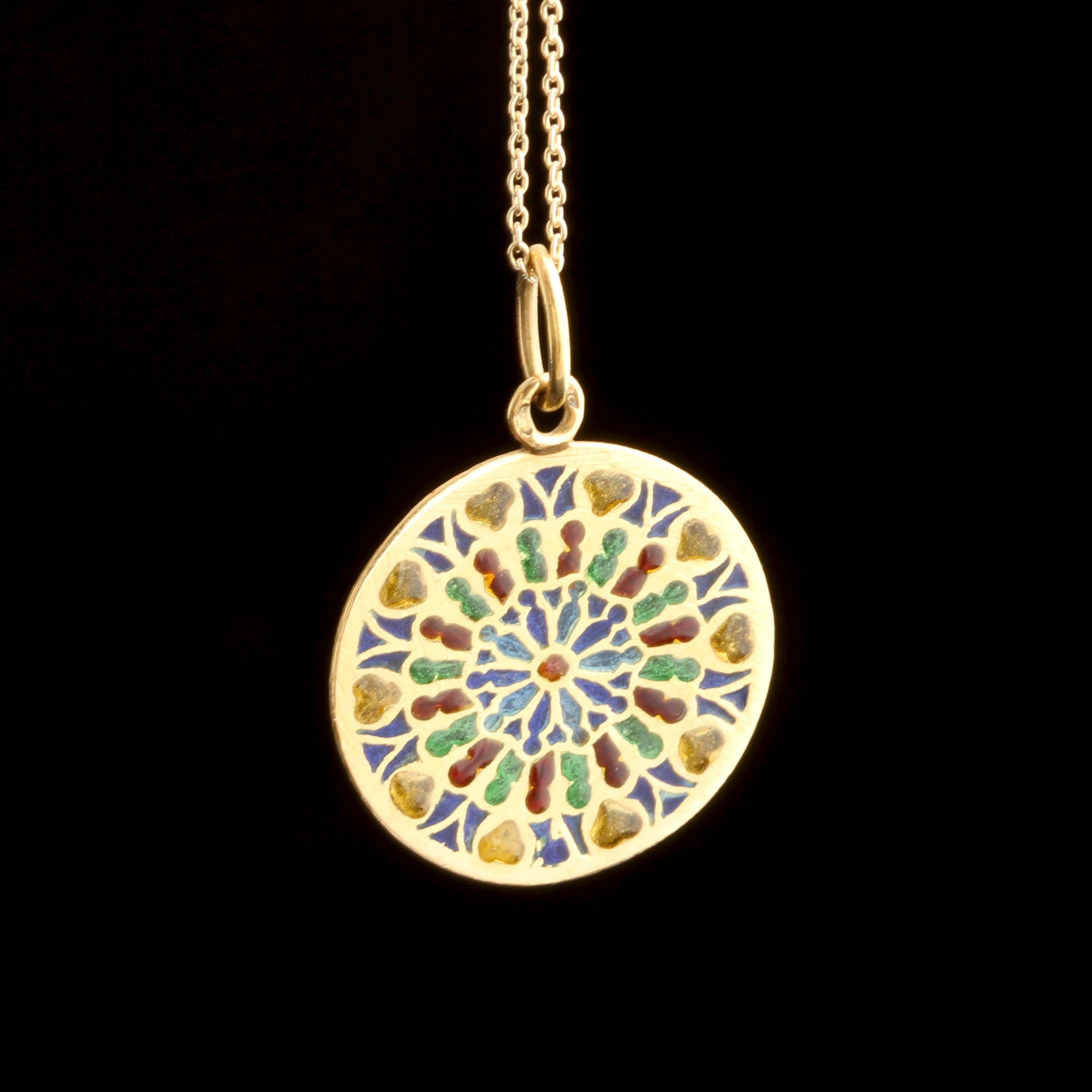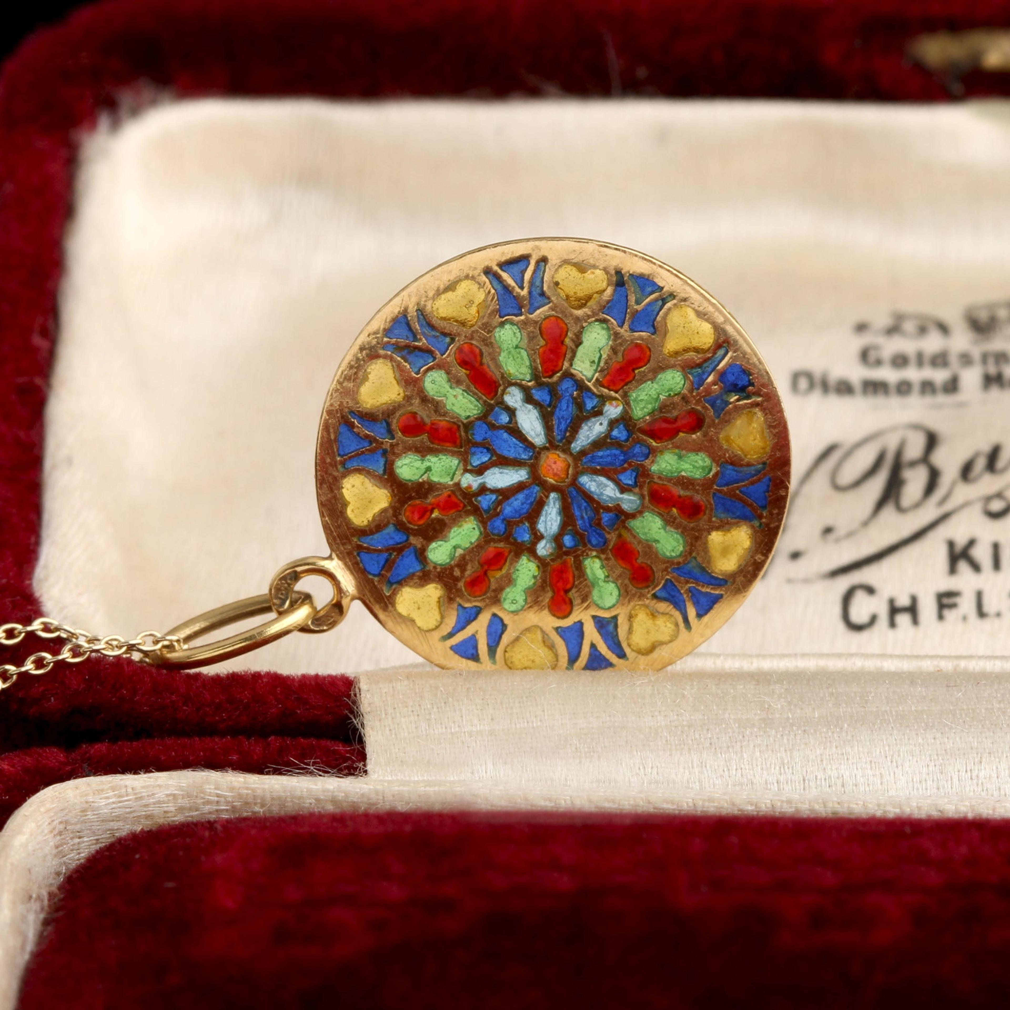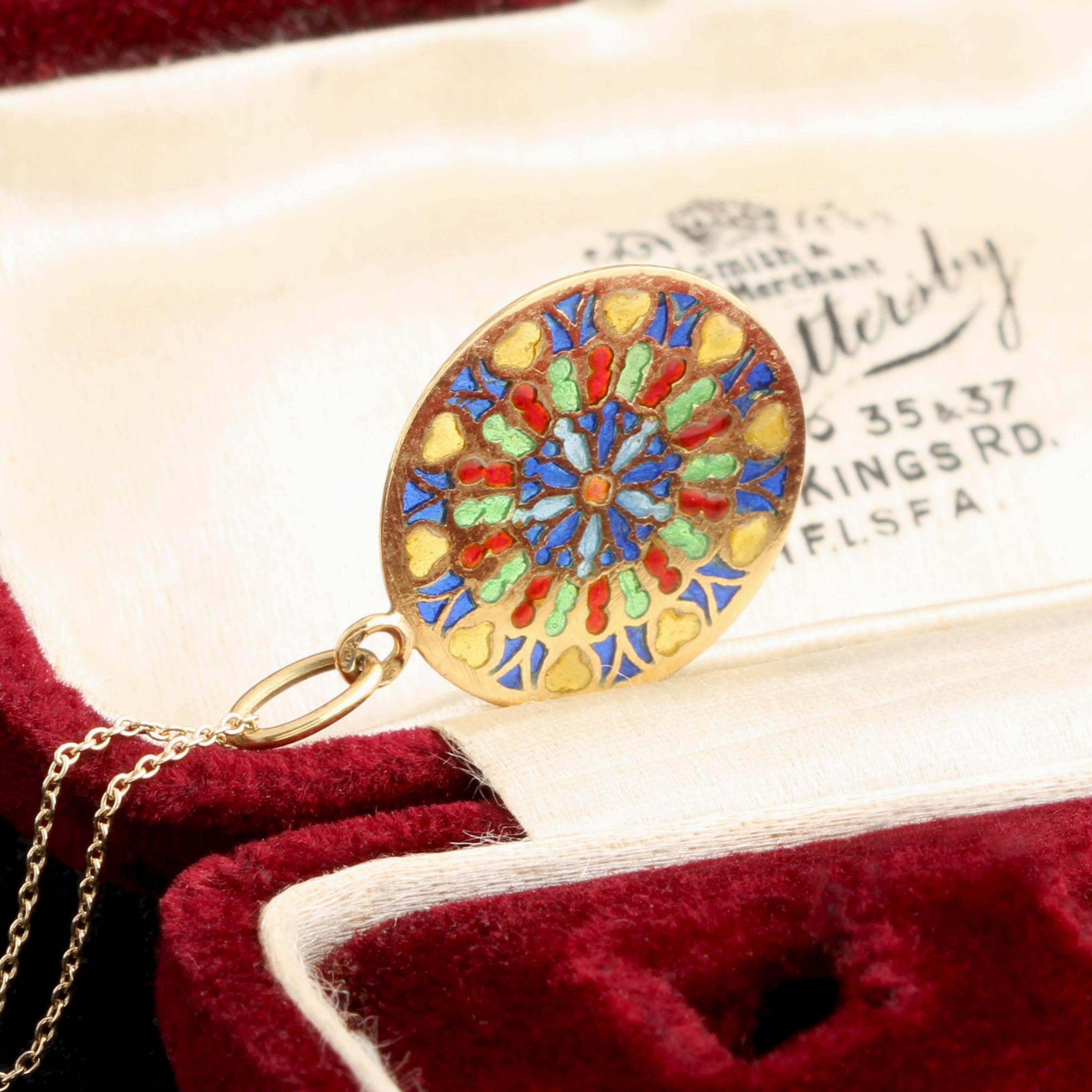 Pliqué-a-jour, French for “letting in daylight,” is a jewelry technique in which enamel is suspended in individual cells sans a metal backing - like miniature stained glass. Hold it up to the light and you'll appreciate the technique, which is considered extremely challenging to do well. This vintage pendant is designed to look like a cathedral rose window. French hallmarks.