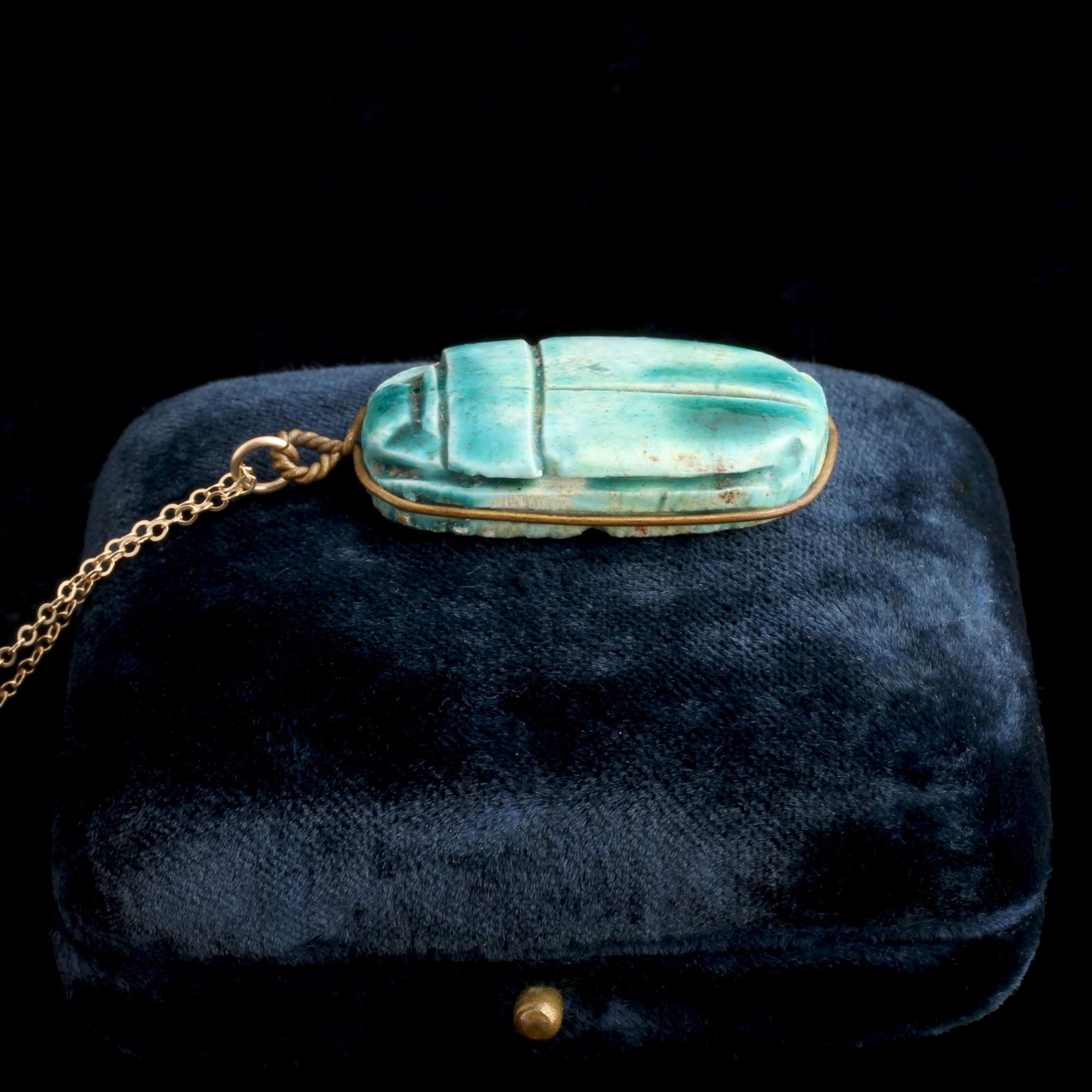 We've given this vintage scarab faience pendant a new life by stringing it onto a delicate gold fill chain.