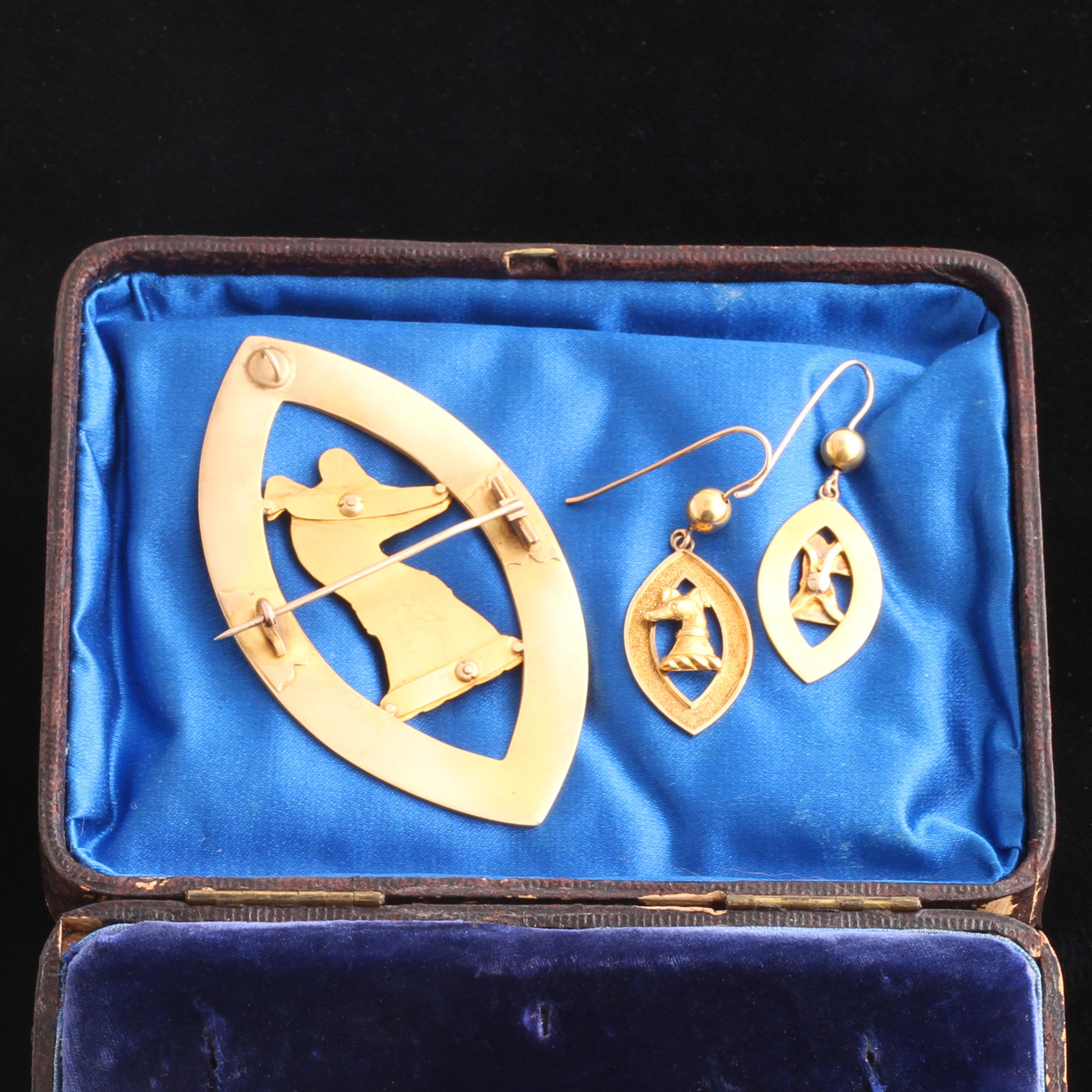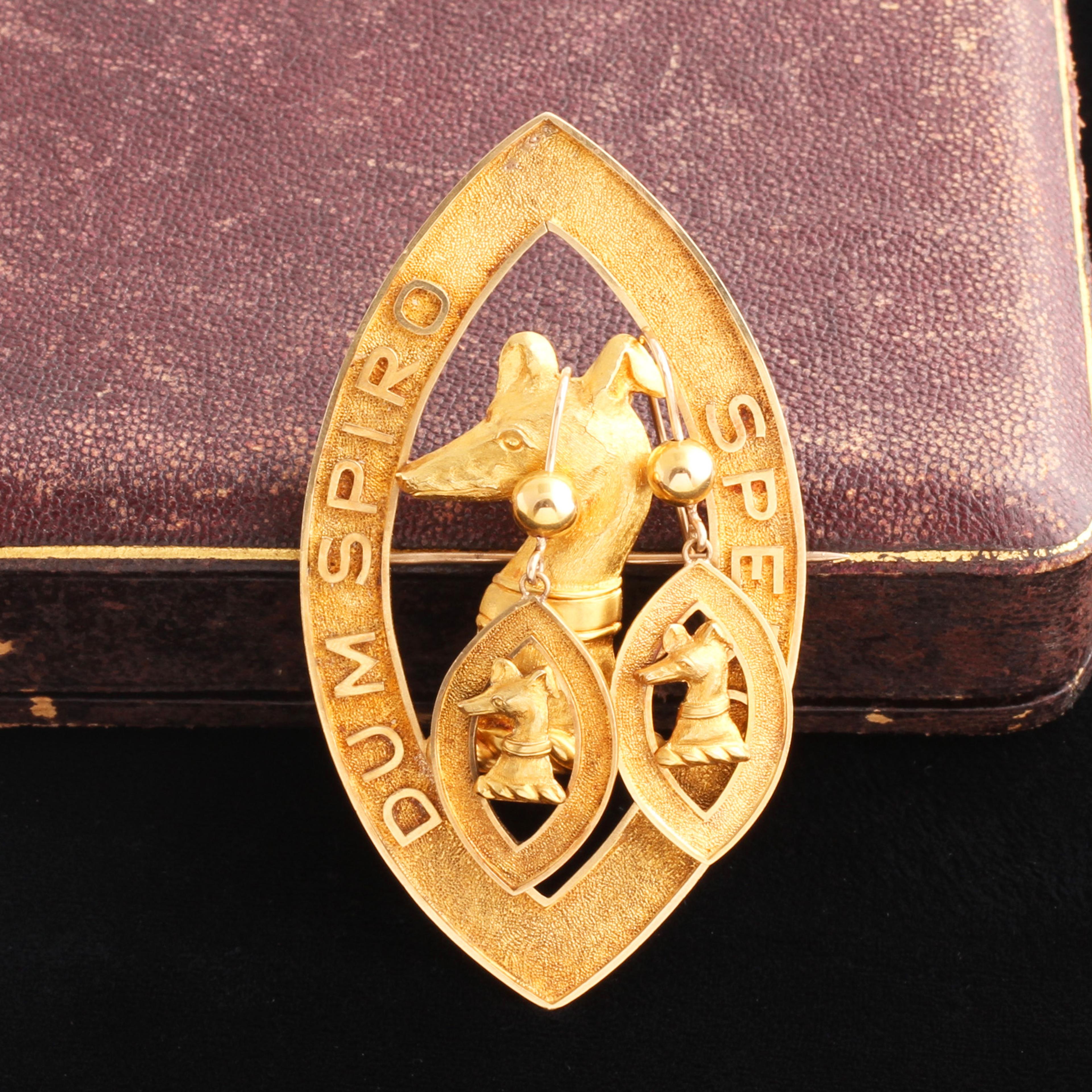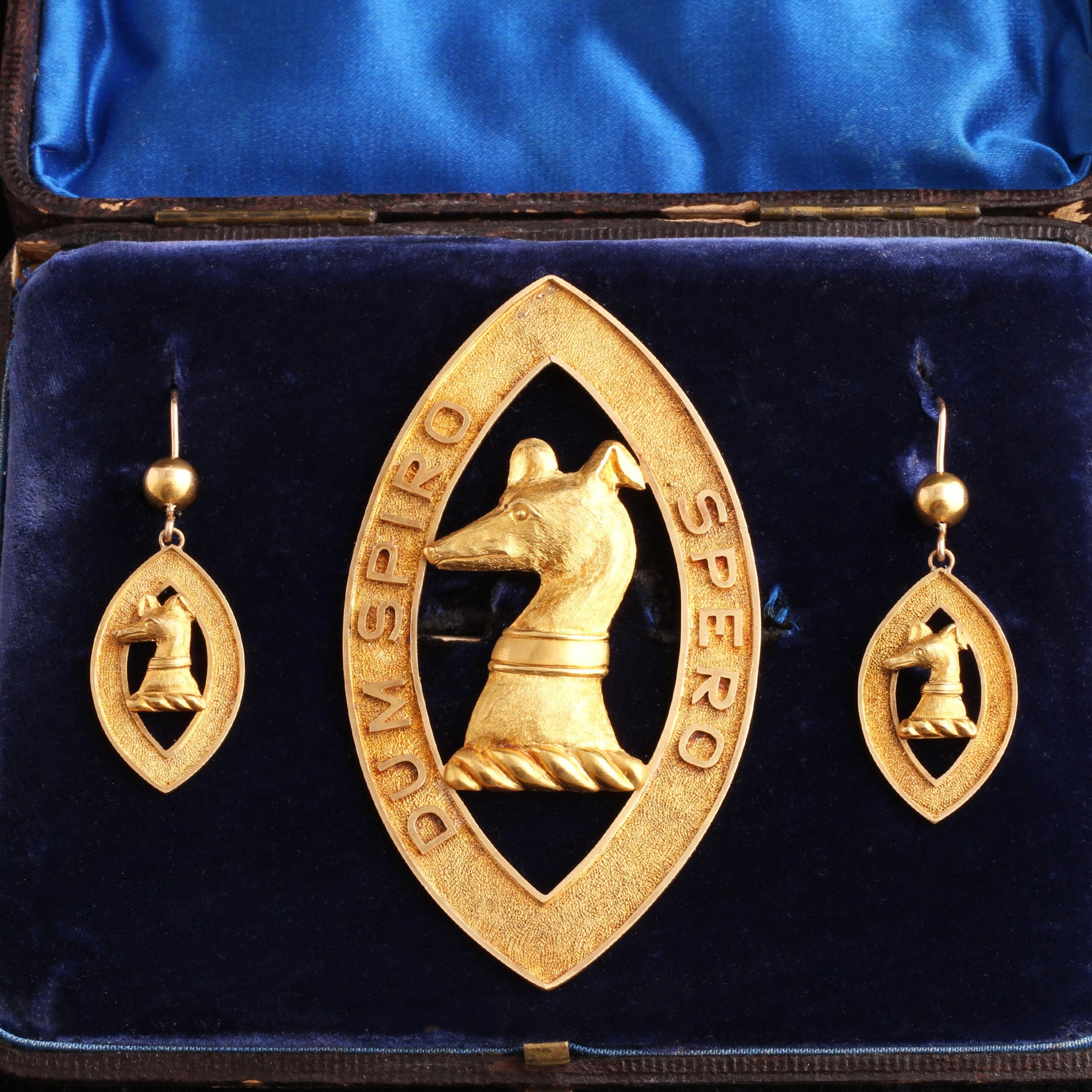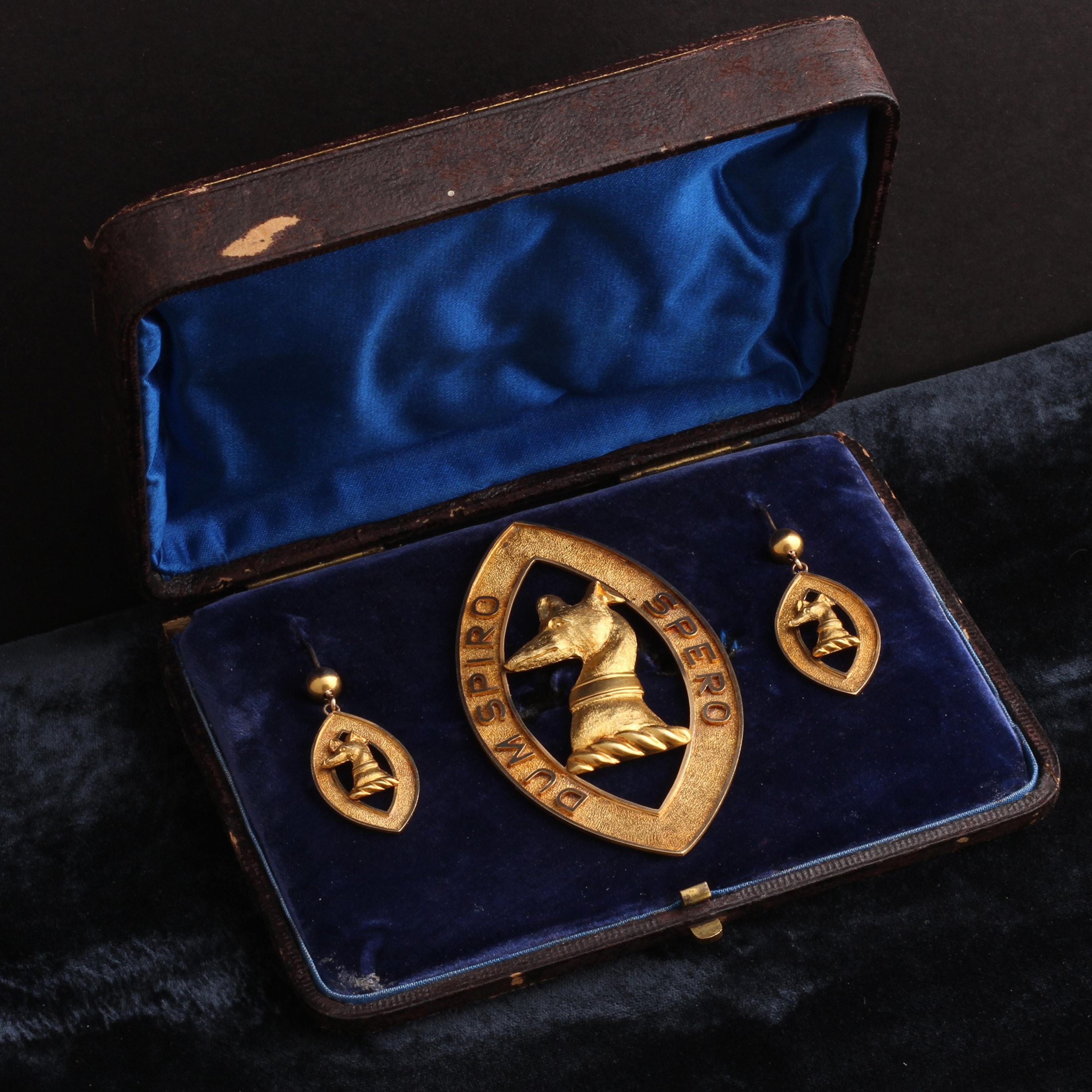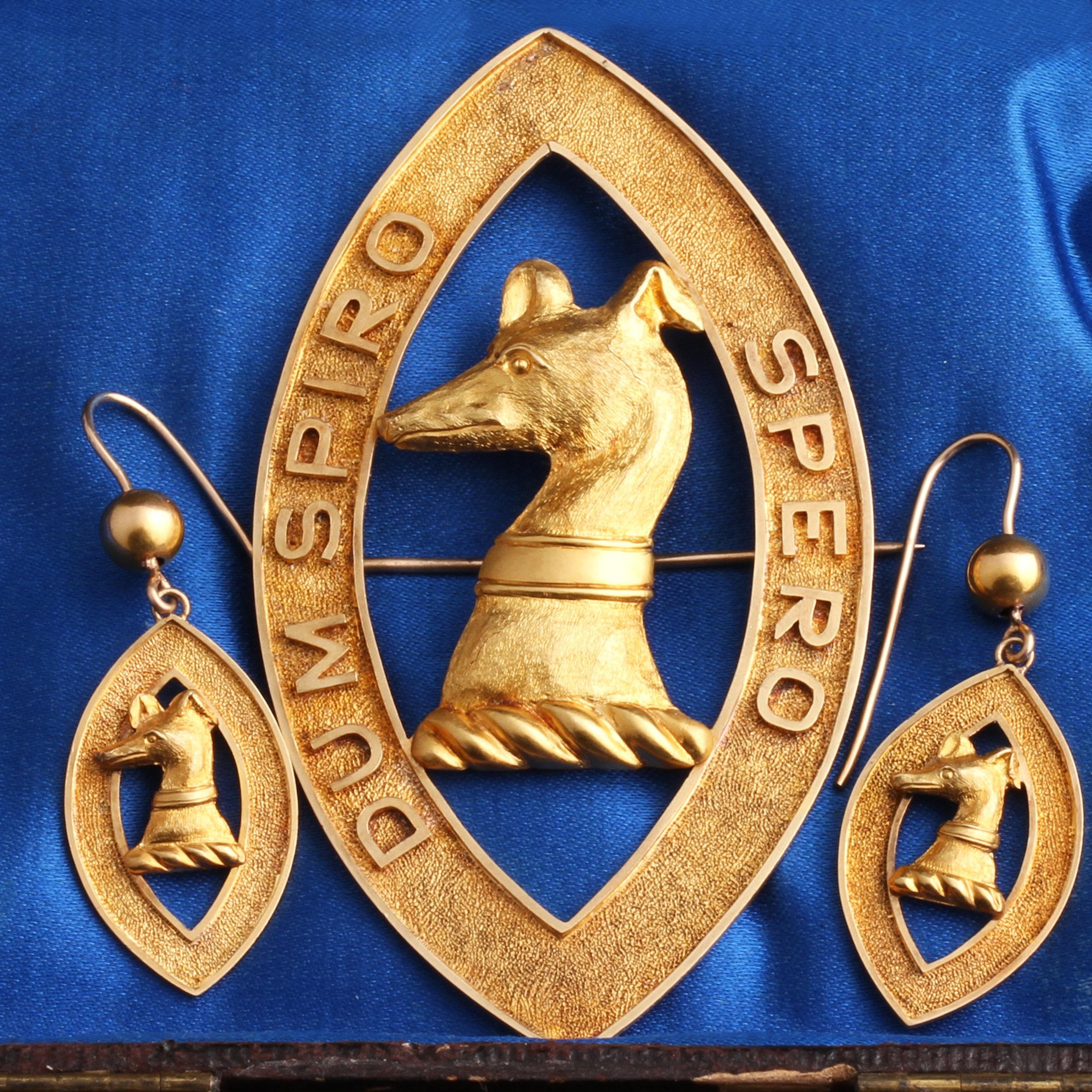 This sensational set of matching brooch and earrings is fashioned in 18k yellow gold and dates to the late Victorian era. Each element features a collared greyhound, the crest of the Hunter family. The large brooch is emblazoned with the family's motto, “Dum Spiro Spero” or “While I breathe, I hope.” Sold in original fitted box.