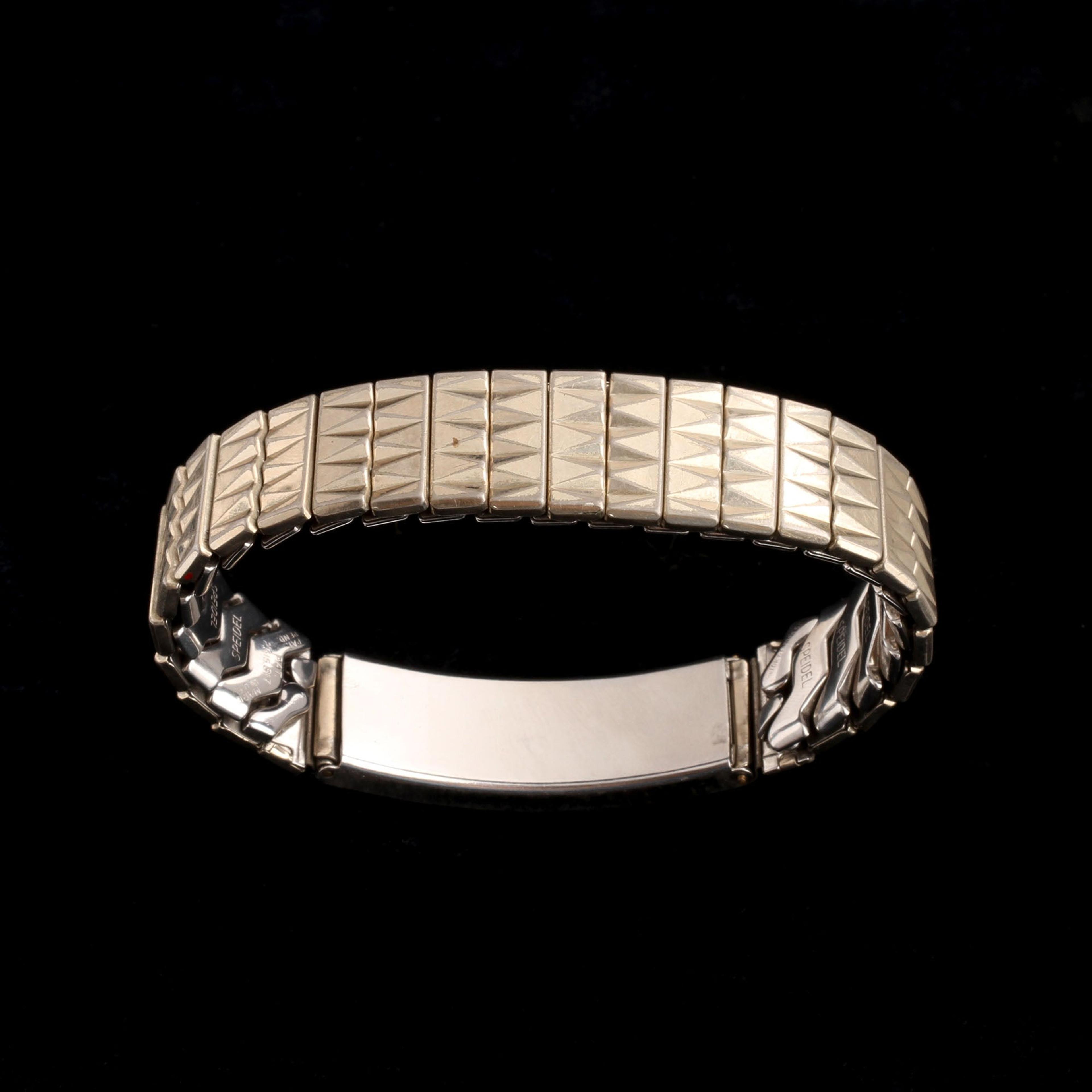 The woman in this picture helps me date the piece to right around WW2. The stretchy watchband-style bracelet is silver-colored, stamped "Speidel" on every link interior, with a rectangular curved photo panel that's 1.5" long.