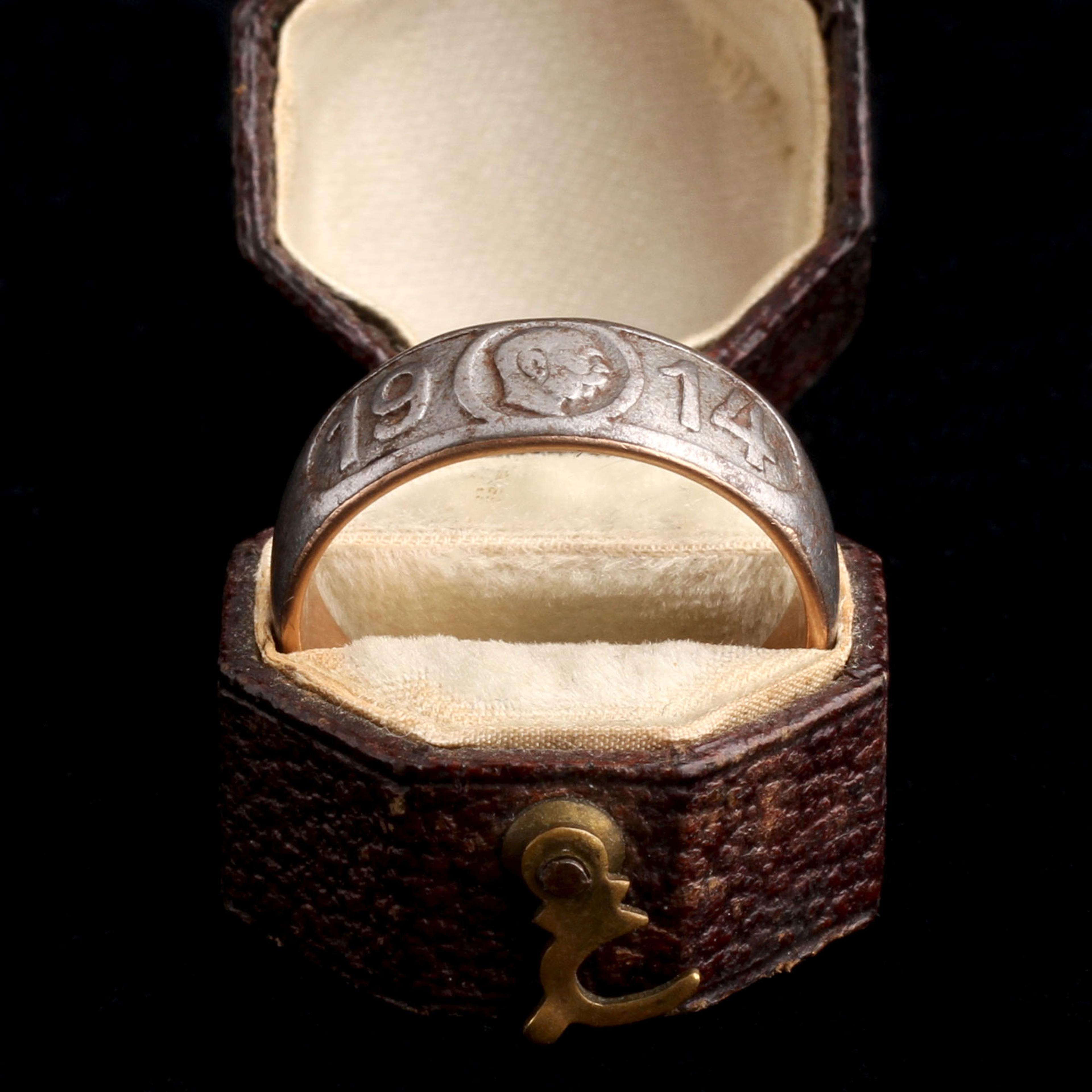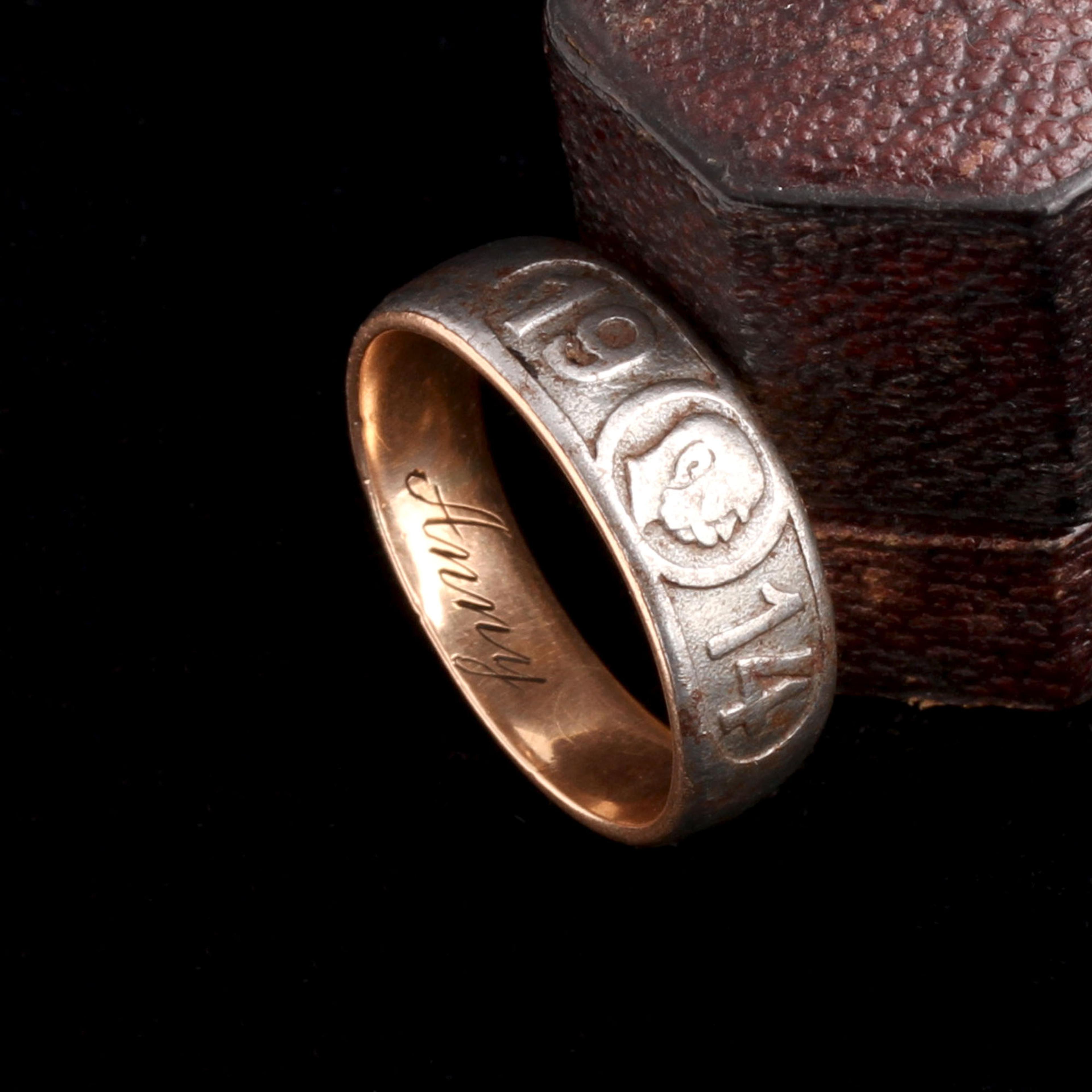The jewelry we call "Berlin iron" was produced as part of the gold-for-iron campaign that began in 1813. To fund the Prussian effort to repel the forces of Napoleon, citizens were urged to donate their gold to the state and were given a piece of lacquered iron jewelry in return. The drive was so successful that the Prussian war chests were filled, but also the wearing of gold jewelry became a social faux pas - unseemly and unpatriotic. As a result, jewelers began to sell tons of the distinctive black Berlin iron jewelry. (Of course lots of people just hid their gold 'till the war was over.) The gold-for-iron campaign was briefly revived during the first world war with less success. This piece is from that German campaign, and is lined with gold (perhaps after the war?) so as not to tarnish the finger. "ANNY" is engraved within.