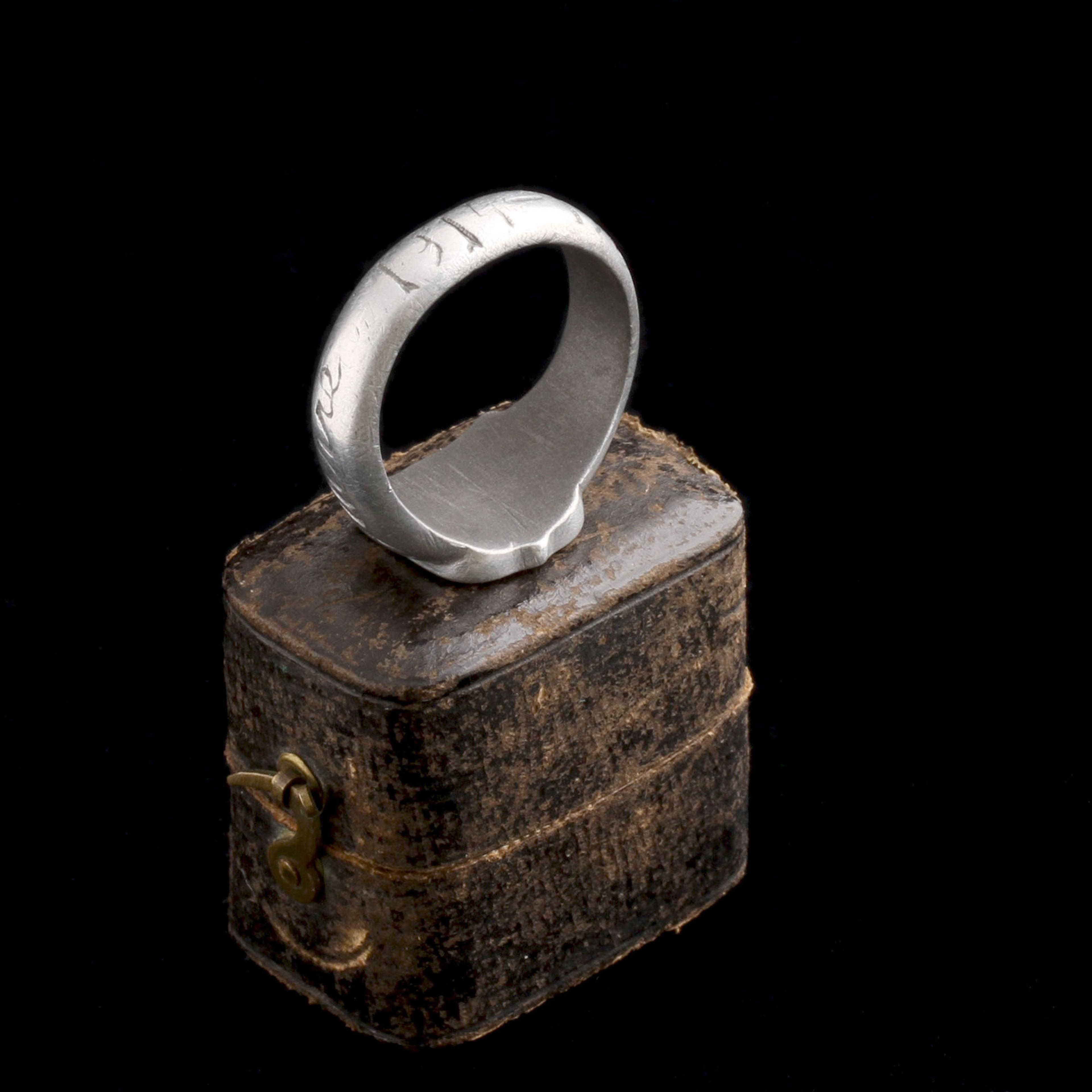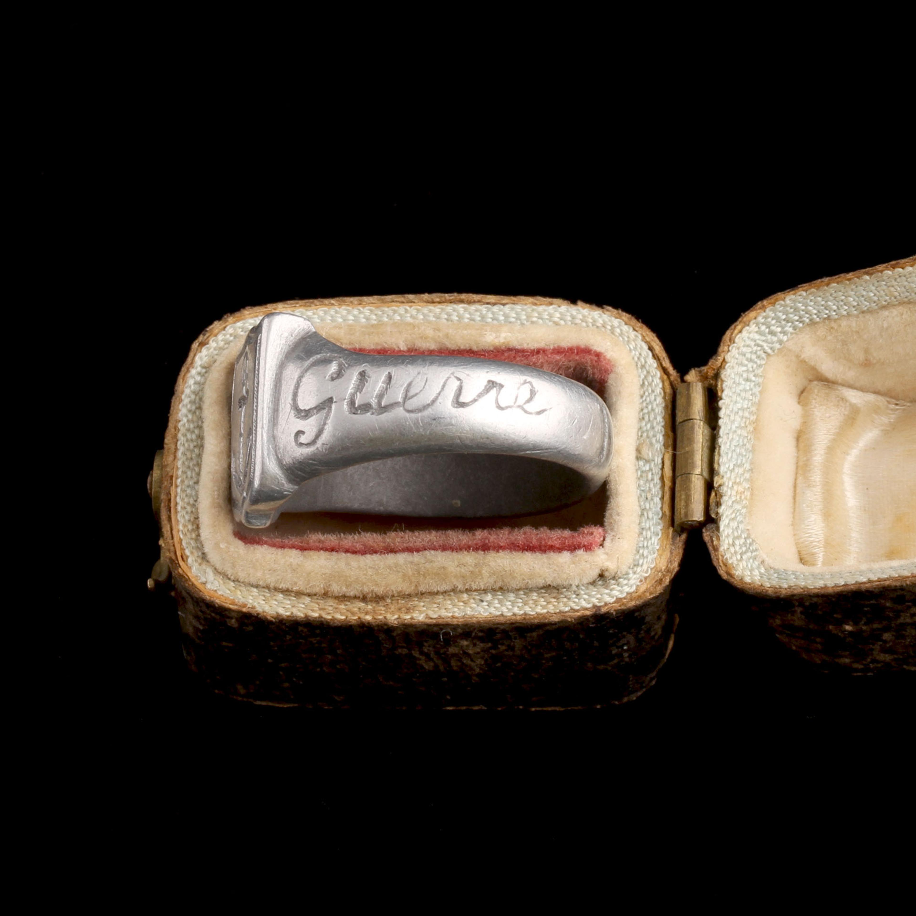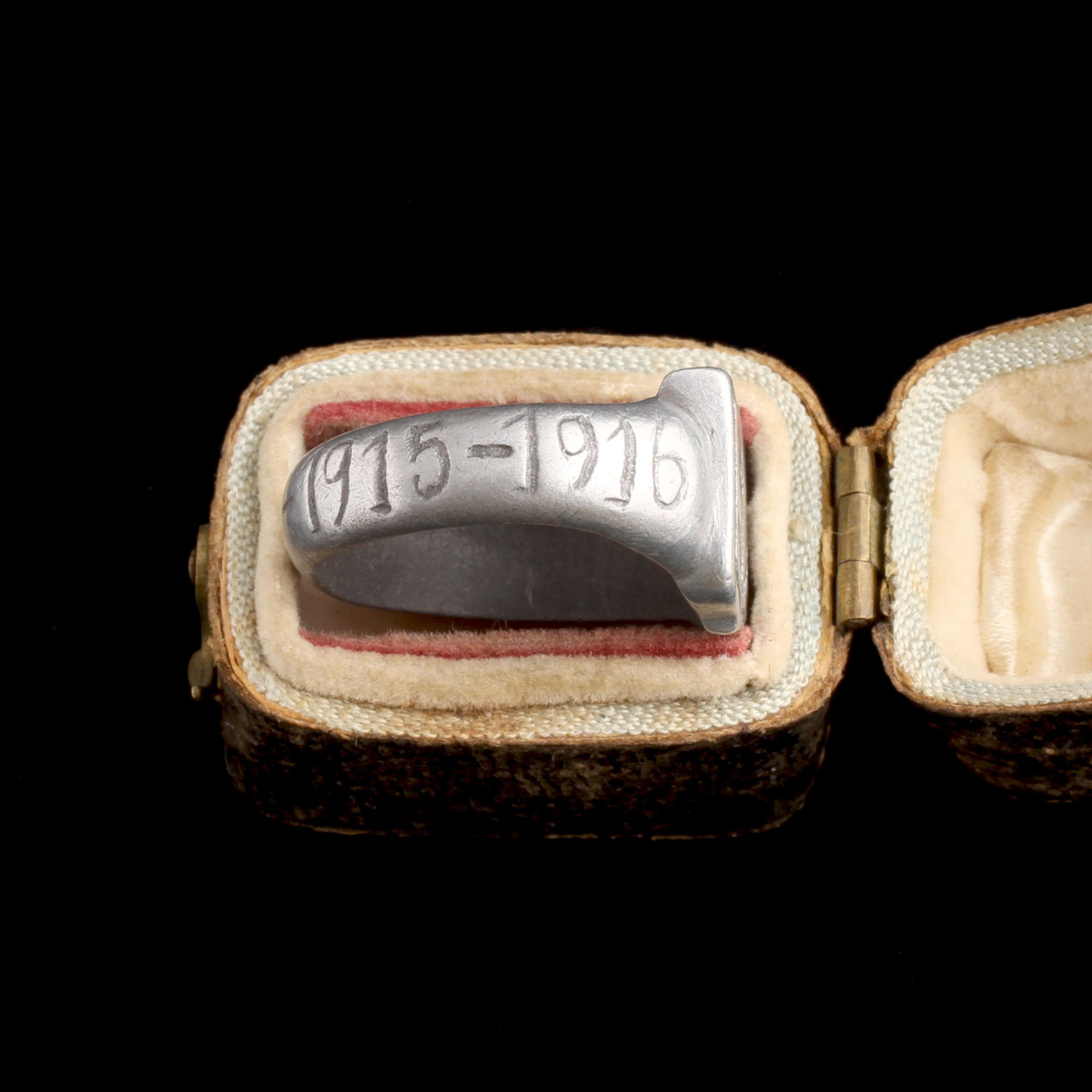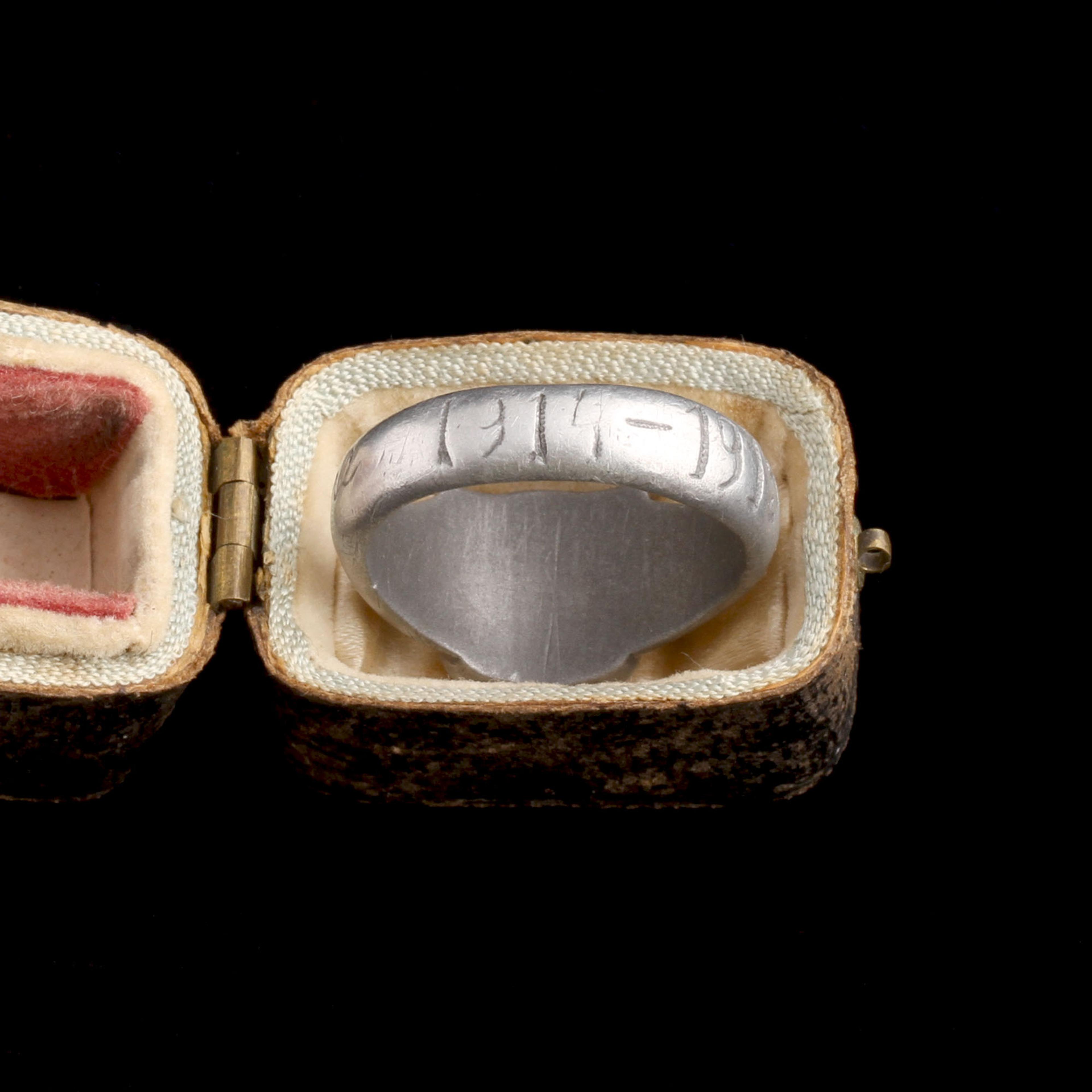This WWI trench art ring is crafted from aluminum, a material often salvaged from the battlefield. It's carved with an anchor—a classic symbol of hope and naval service. One shoulder is engraved with the word “Guerre” (French for war), while the other bears the years 1914–1916, marking the early, brutal stretch of the Great War. It was almost certainly hand-made by a soldier during downtime at the front or in recovery using scrap metal.